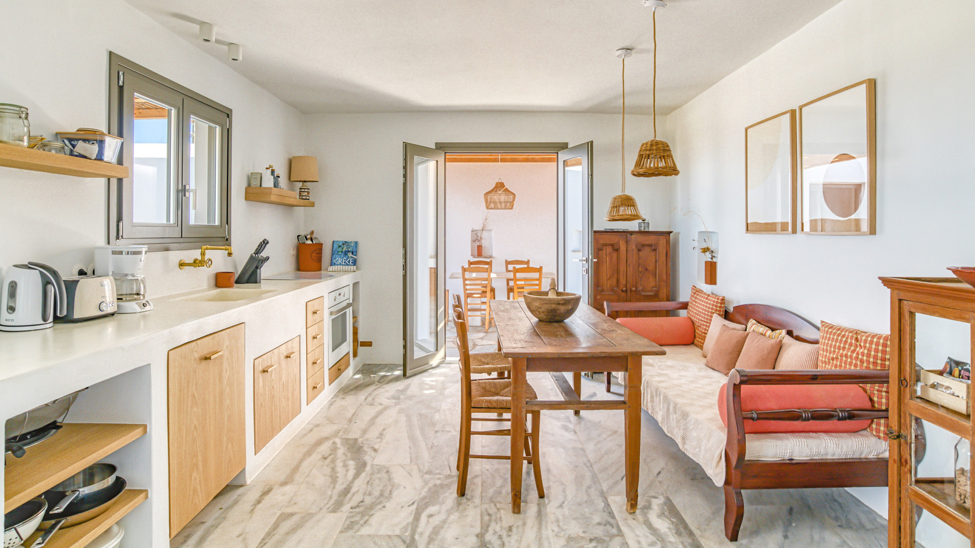 Kiwi’s interiors are simple yet functional, with a linear design that blends authentic furnishing elements with the conveniences of a modern home. The bedrooms are spread across three separate areas: one in the main house, which also includes the kitchen and living room, and the others evenly distributed between the two guest houses. This layout makes it ideal for two families or groups of guests seeking a bit of extra privacy.