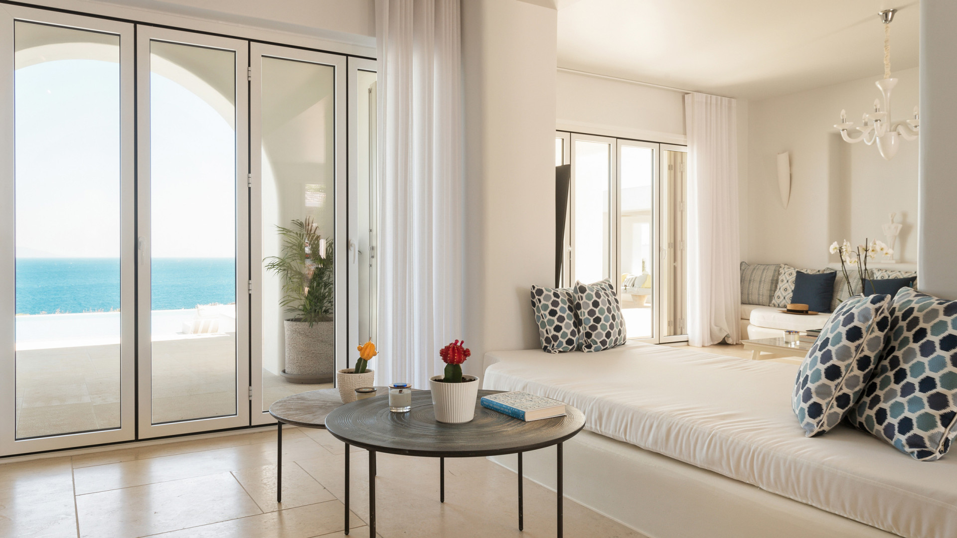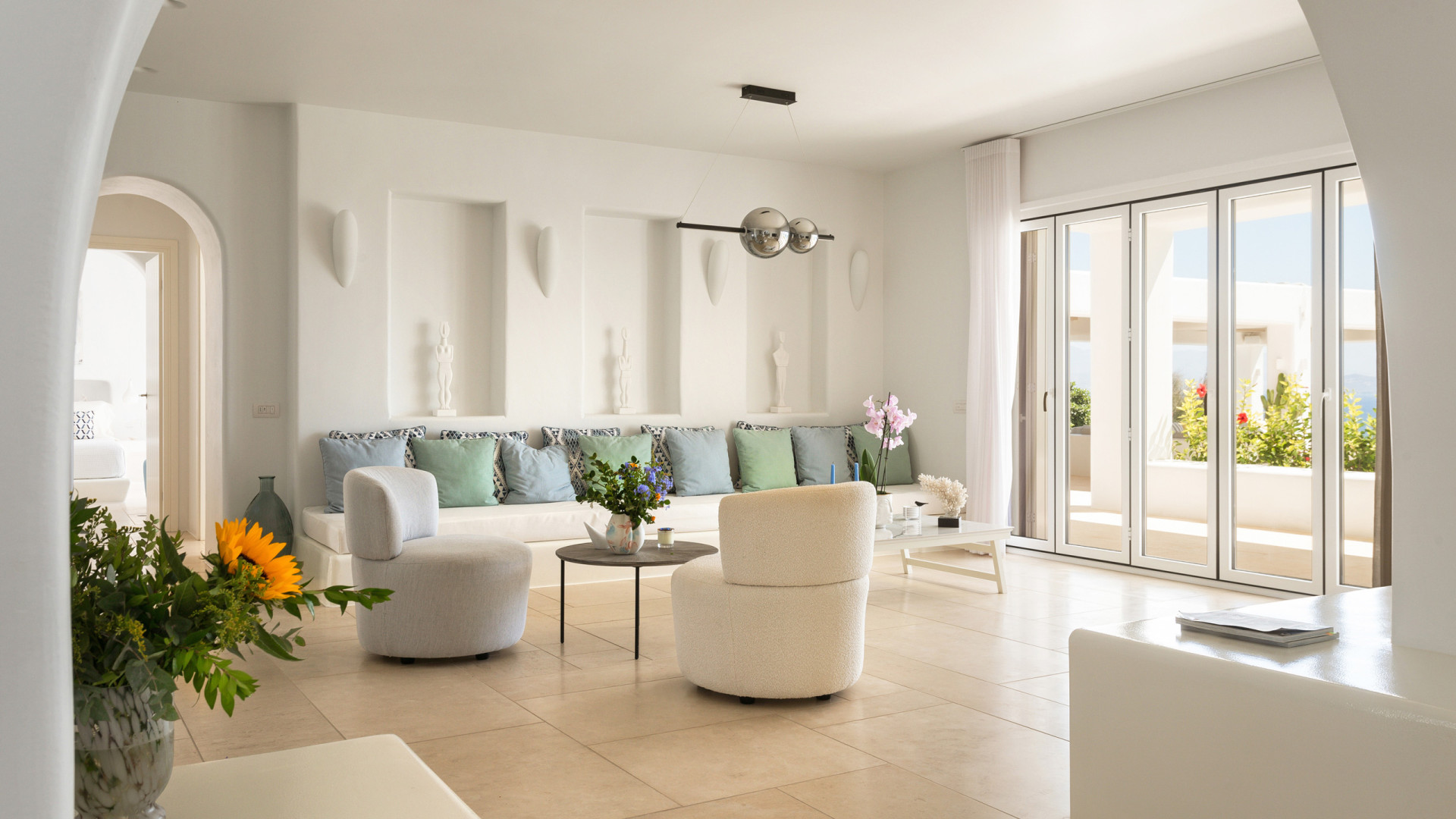 Internally the style is contemporary and elegant, with an eye to the Cycladic tradition always evident. The predominant colour is always white, with well-selected furnishings to personalise and embellish every room. Technical equipment and the quality of the materials used, guarantee an excellent general standard, both in the common areas and in the numerous bedrooms.