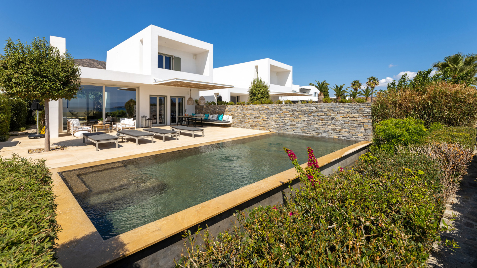 The Villas mirror each other in layout and amenities, ensuring all guests are guaranteed the comforts expected in a luxury villa. Both villas enjoy an entertaining terrace taking advantage of the Aegean Sea views. The main outdoor areas are complimented with each villa having it’s own infinity pool, surrounded by an elegant outdoor dining area, lounge area and the inviting sun lounges. A gravel path makes its way to the back of each property, leading to the guest bedrooms and are lined by thoughtfully planted Mediterranean plants - enhancing the natural ambience even further.