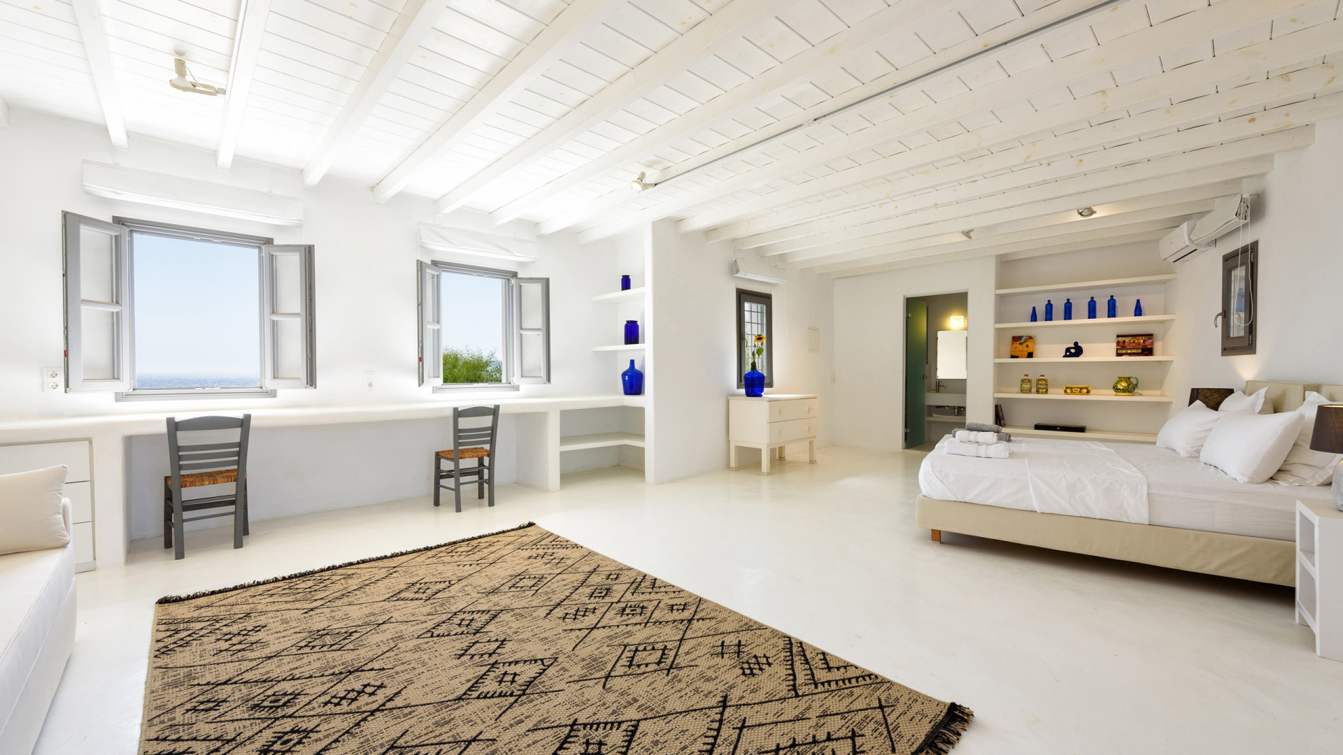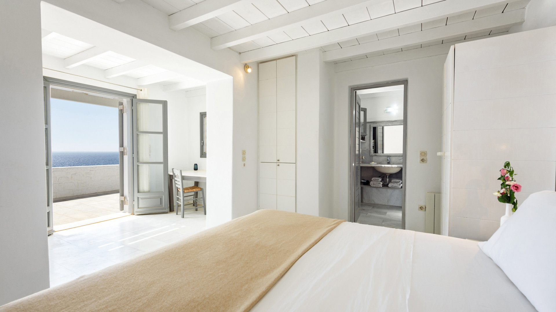 Displaying a charismatic Cycladic design, the property lays amidst a suggestive garden composed of local vegetation mixed with olive and cypress trees. The terraces of The Seagull stretch through the garden, providing various sitting areas and two spaces furnished for outdoor dining, all bearing a good level of privacy and intimacy. Beside the recently built seafront infinity pool, an elegant plunge pool is located on the back patio, ideal for a dip at any time of the day while lounging on the comfortable sun beds and deck chairs.