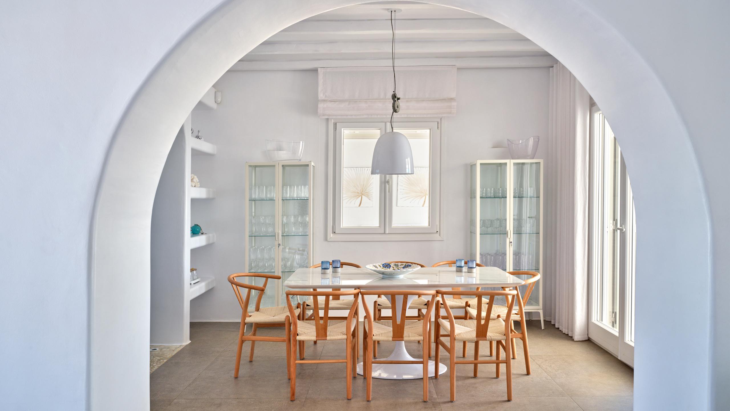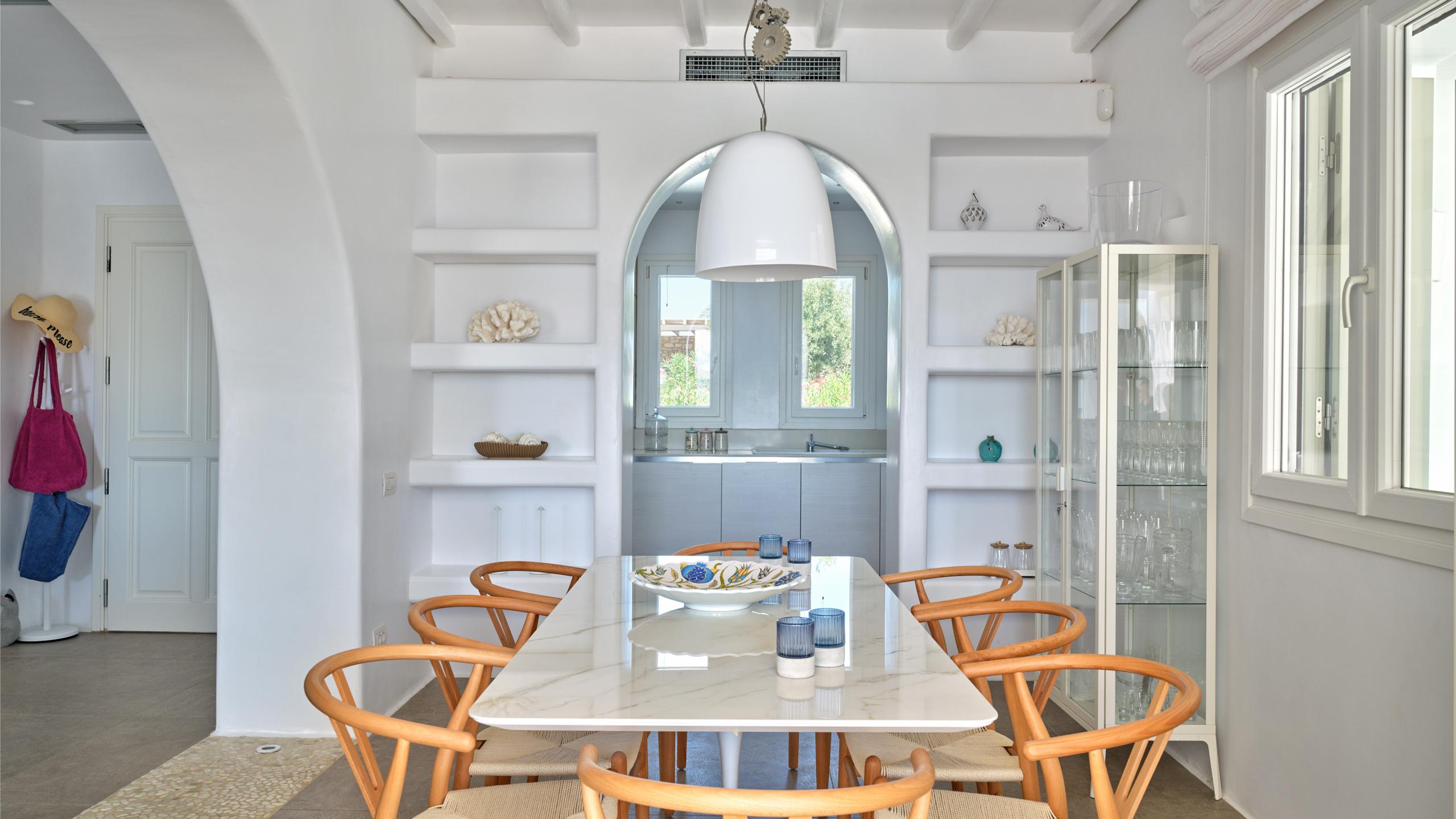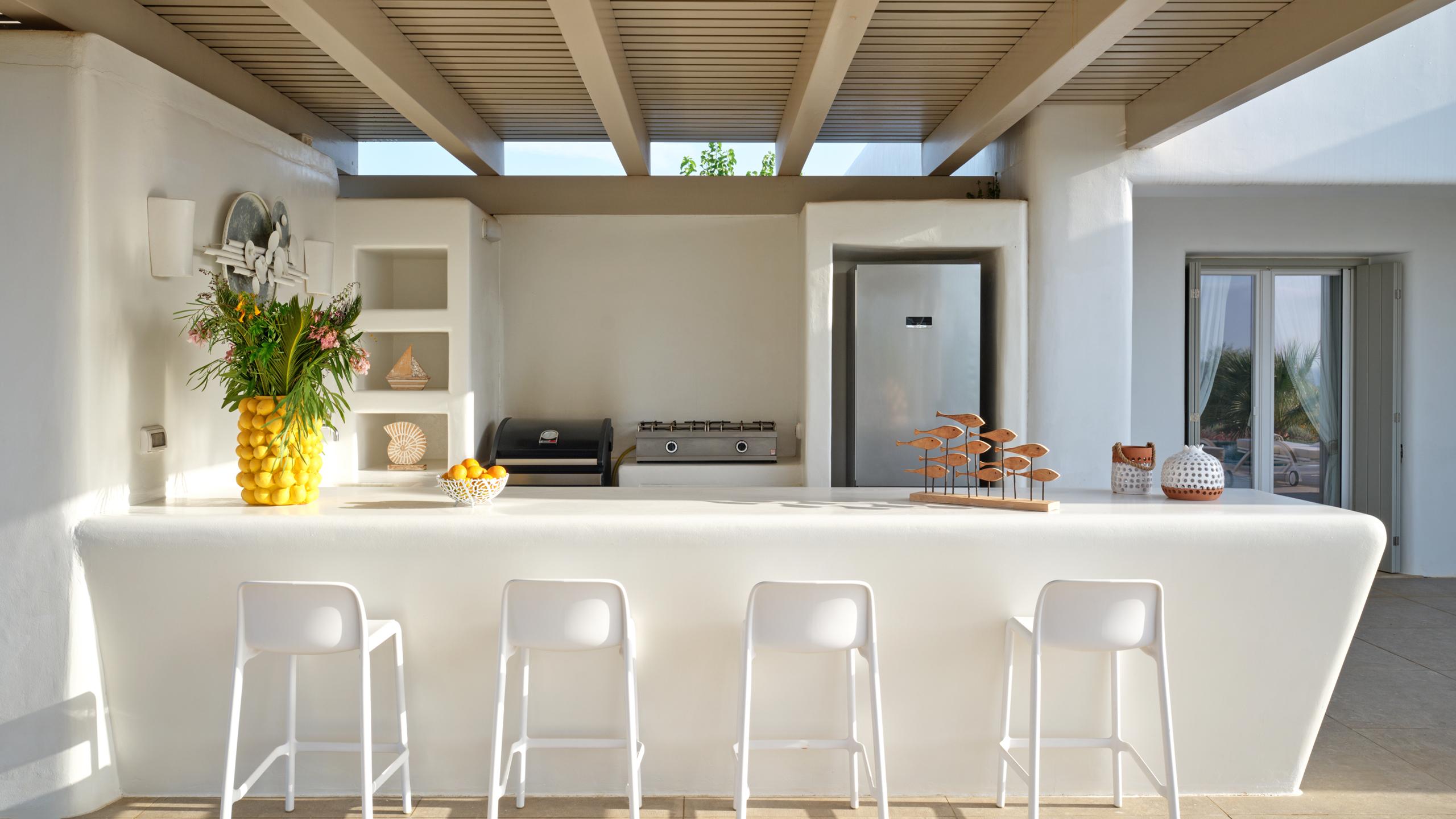 This modern eight bedroom villa, still retains it’s Cycladic charm with whitewashed archways and wooden poolside pergolas. The fully equipped, modern kitchen, indoor dining and lounge, flow seamlessly out into the large outdoor areas. Designed for outdoor summer living, the outdoor areas include a lounge and dining area, bar, barbeque, bathroom and shower. Thoughtful design has ensured guests can seek some privacy if so desired, or can all come together around the large infinity pool. The villa is complemented with landscaped gardens.