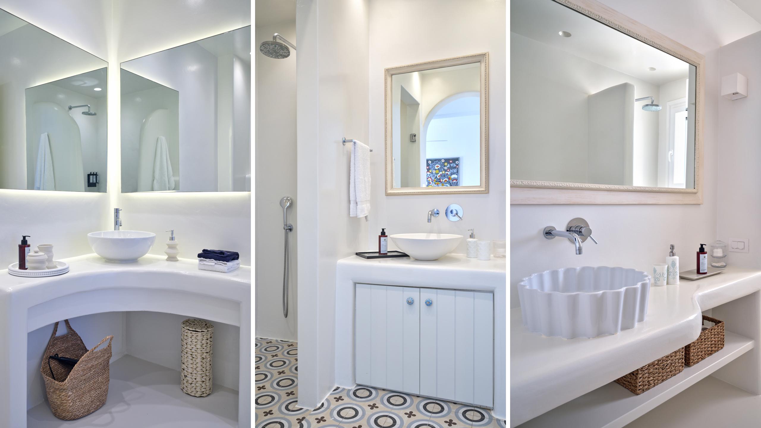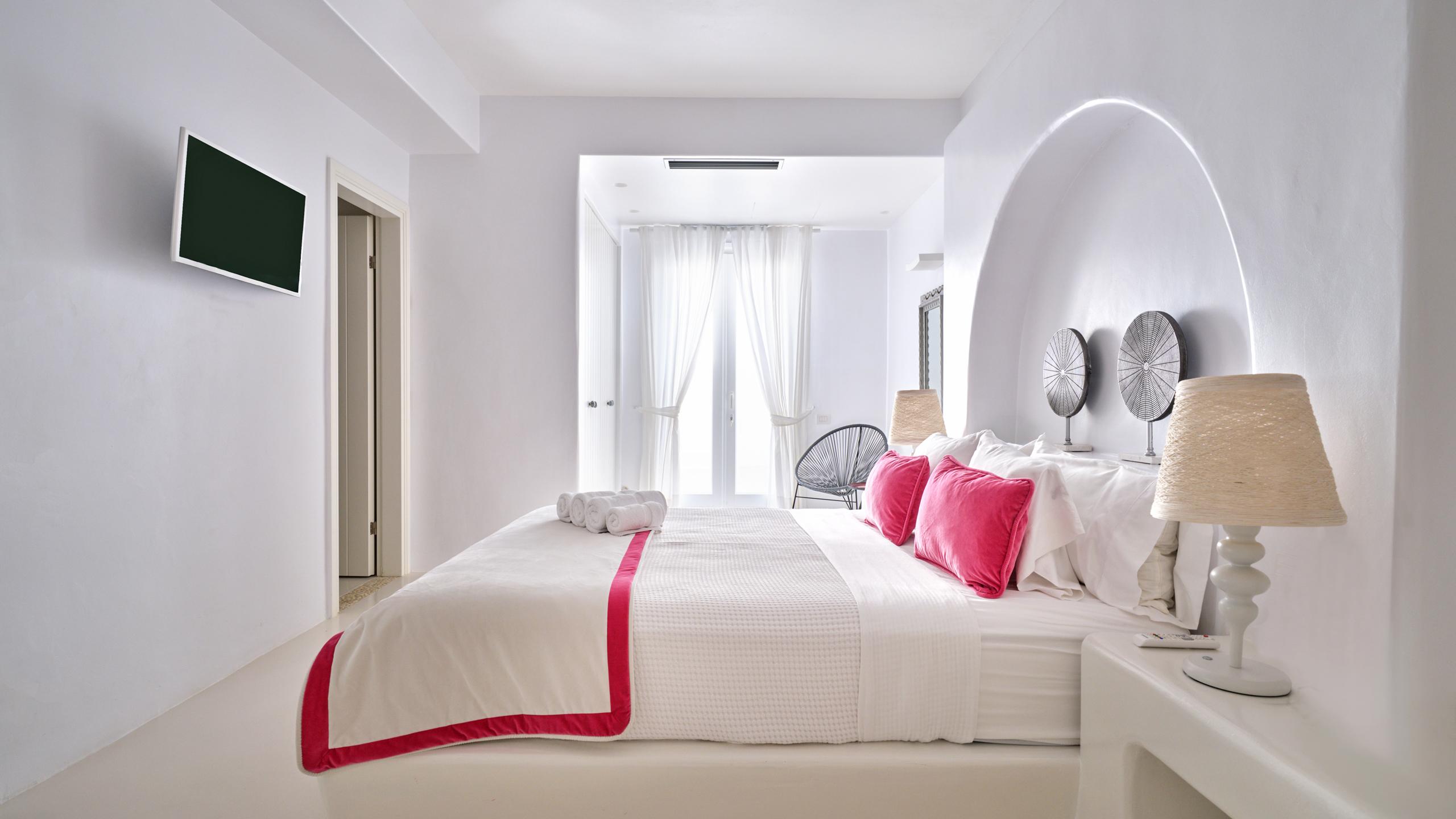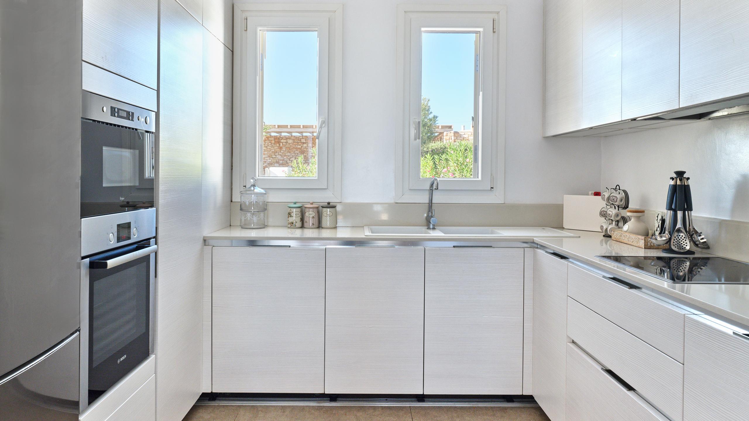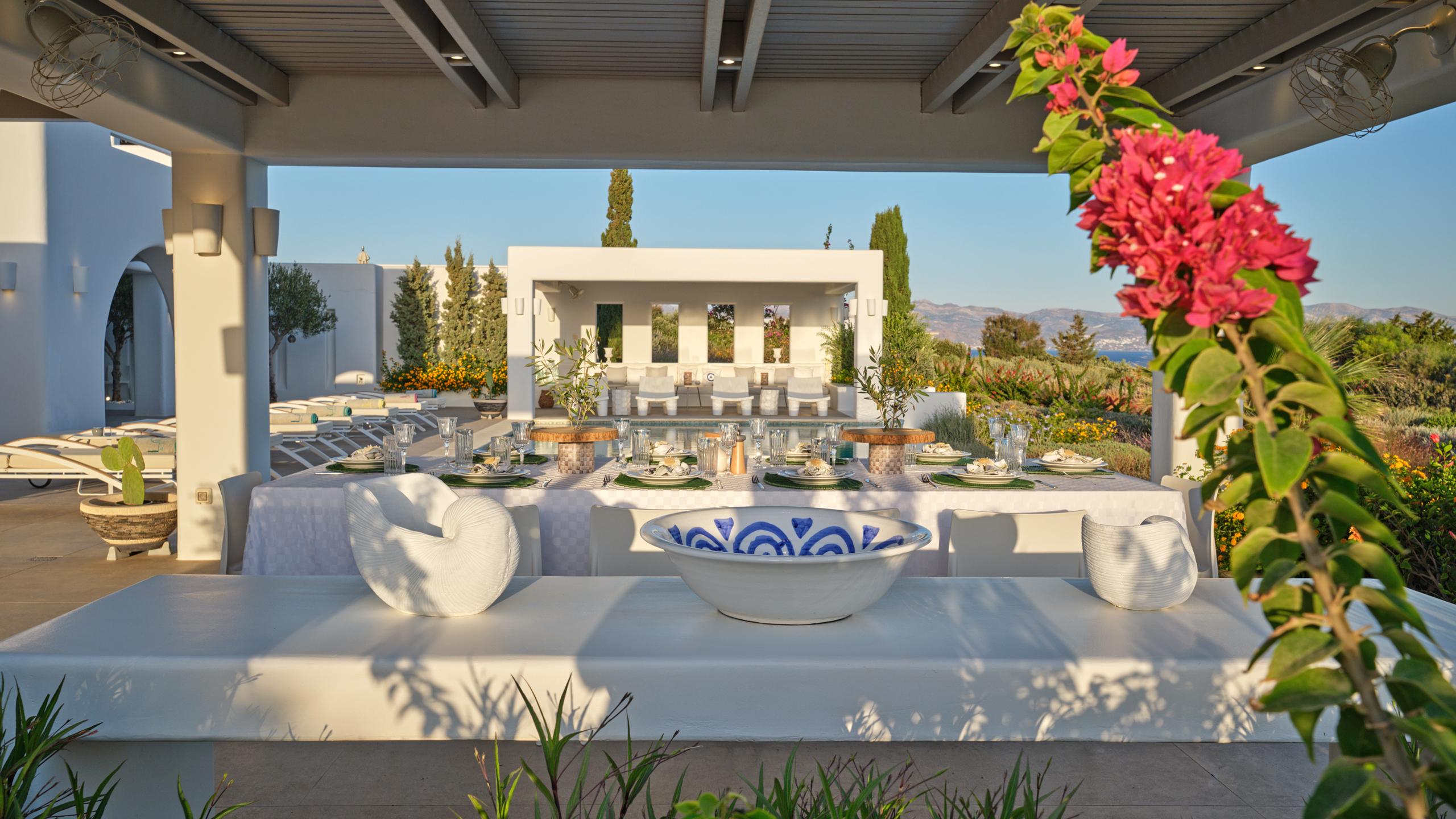 This modern eight bedroom villa, still retains it’s Cycladic charm with whitewashed archways and wooden poolside pergolas. The fully equipped, modern kitchen, indoor dining and lounge, flow seamlessly out into the large outdoor areas. Designed for outdoor summer living, the outdoor areas include a lounge and dining area, bar, barbeque, bathroom and shower. Thoughtful design has ensured guests can seek some privacy if so desired, or can all come together around the large infinity pool. The villa is complemented with landscaped gardens.