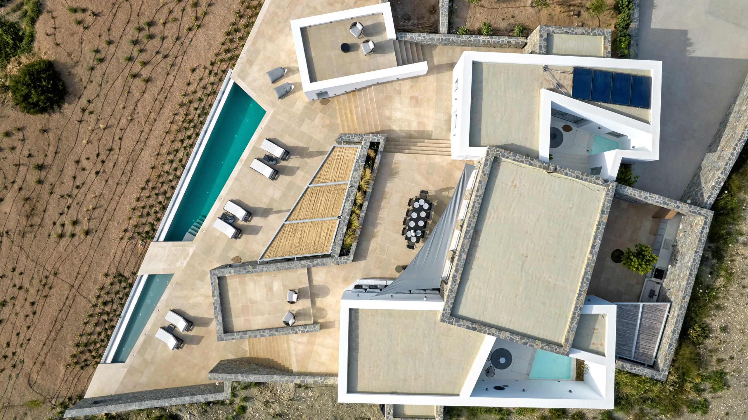 Two further guest bedrooms, each with ensuite, are located on the lower level with both enjoying external, independent access. Again with one bedroom being located on the Northern side of the villa and the second on Southern side. The lower level also comprises of a shaded lounging area, swimming pool and outdoor shower. The impressive swimming pool is split into two parts - one shallow end, perfect for young children or if guests simply want to lounge in the pool and one deeper end allowing for swimming.
