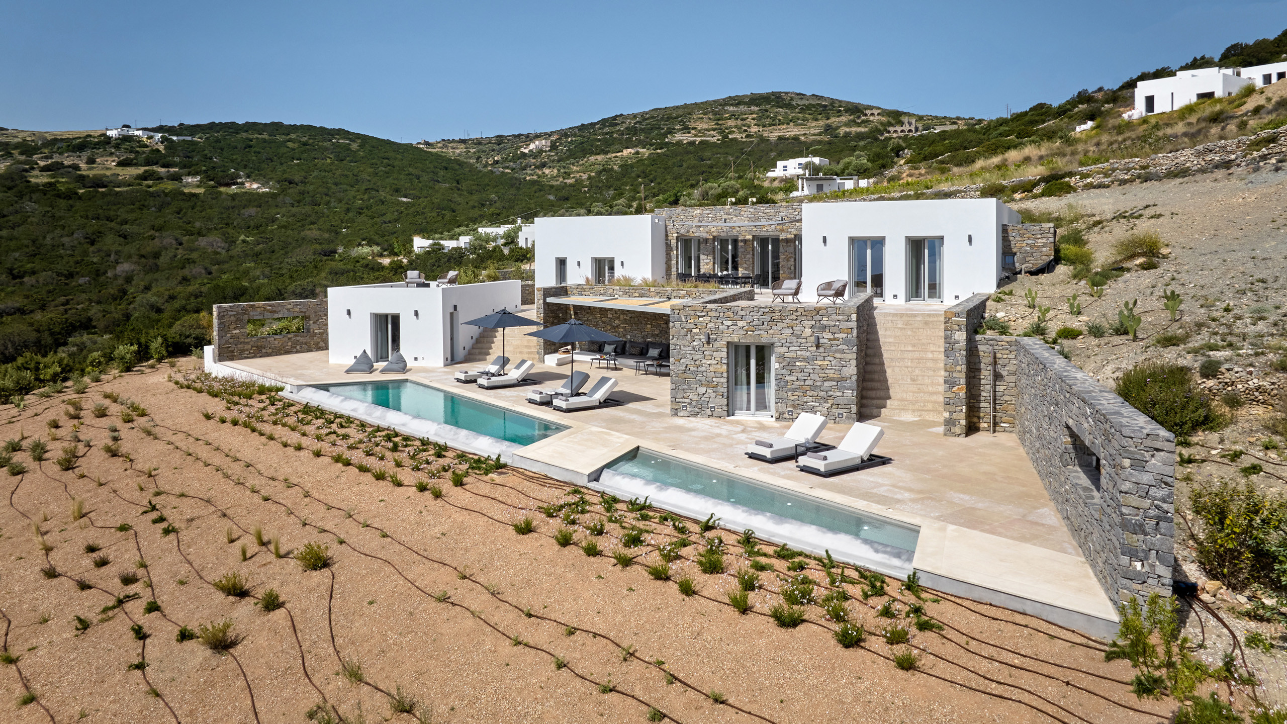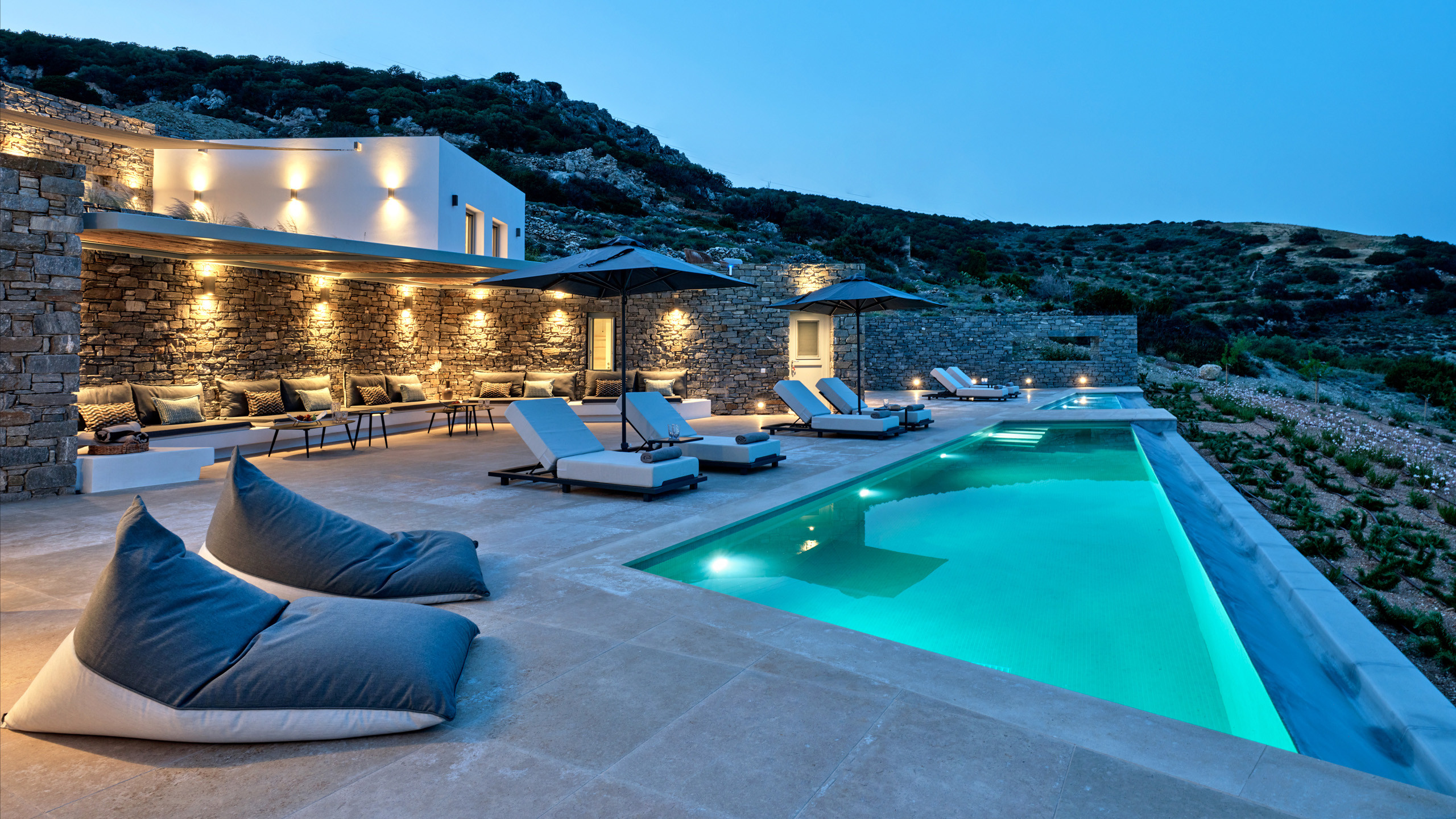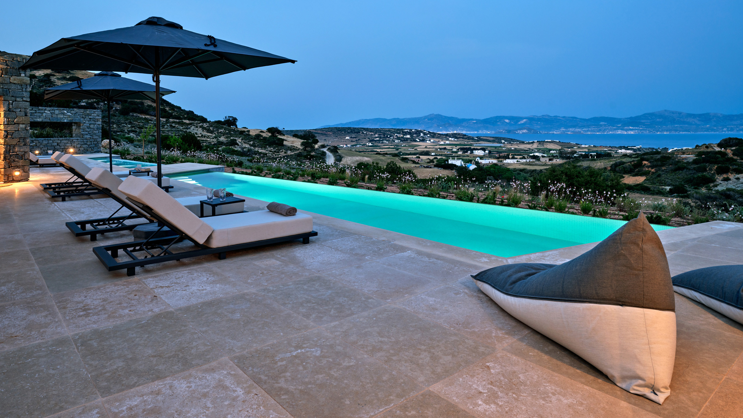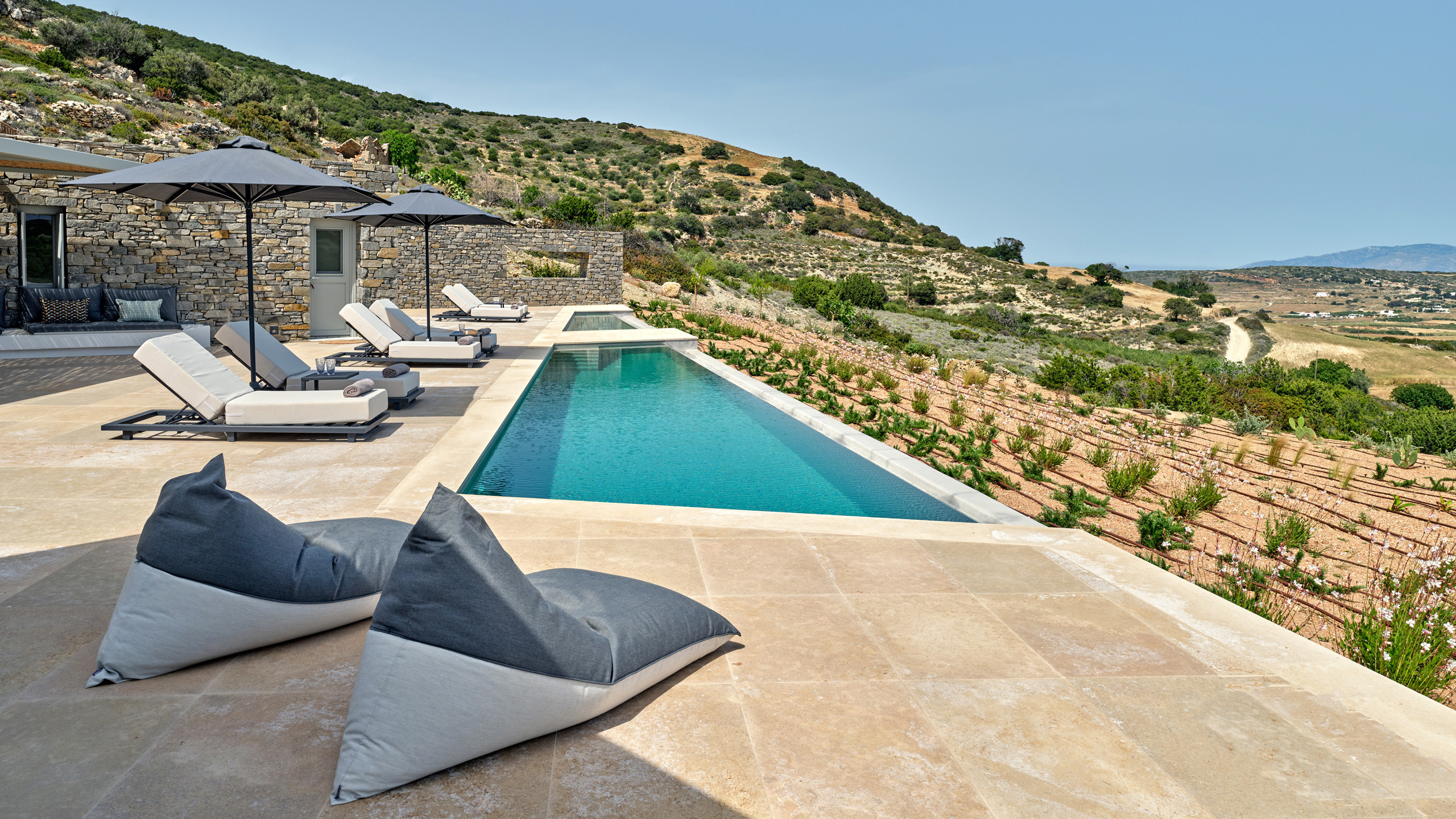Recently completed, Villa Kulmus is modern in design and is privately located close to the popular, cosmopolitan town of Naoussa. The impressive house design flows effortlessly between indoor and outdoor living areas, enjoying Aegean Sea views across to the island of Naxos.