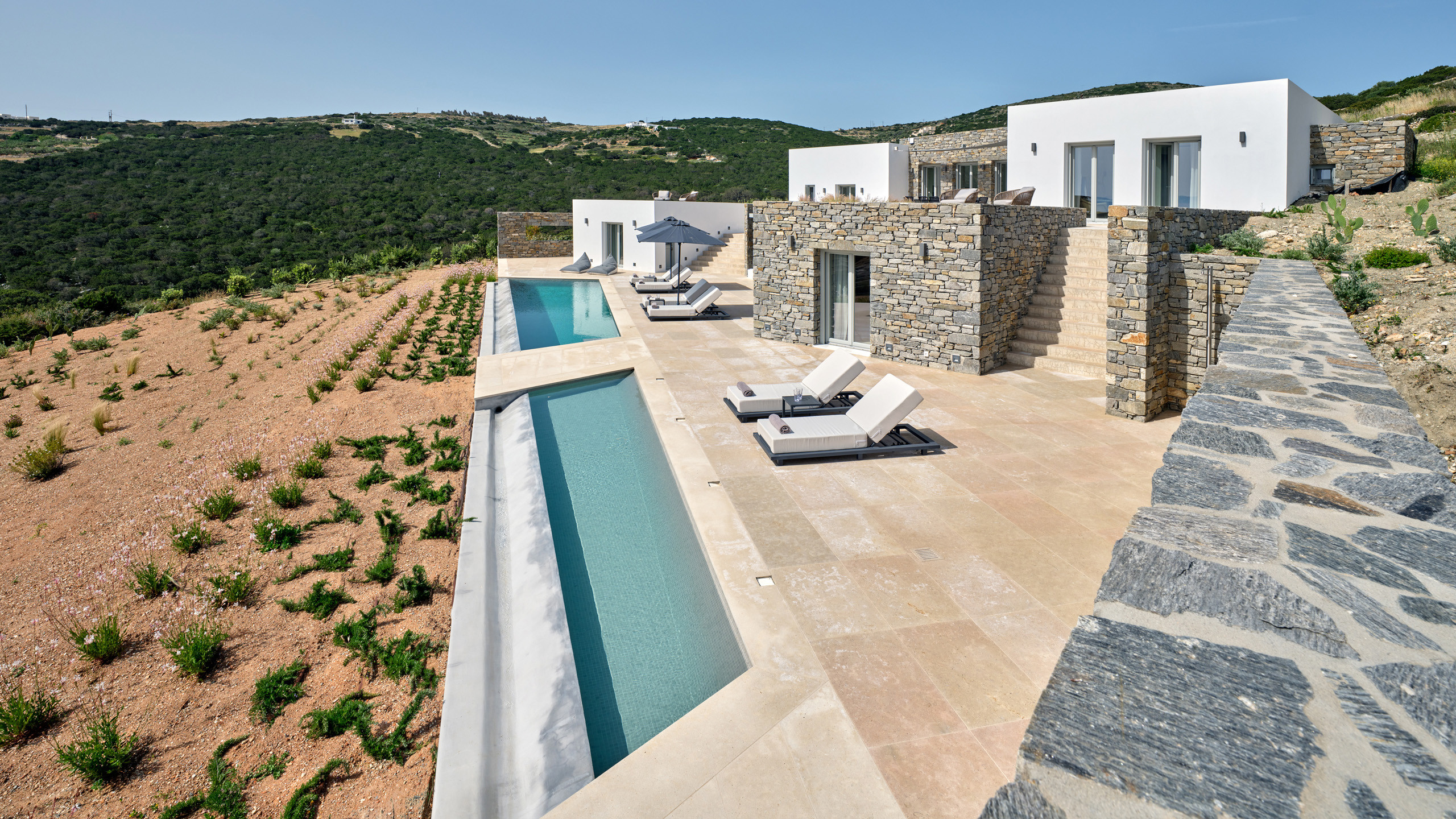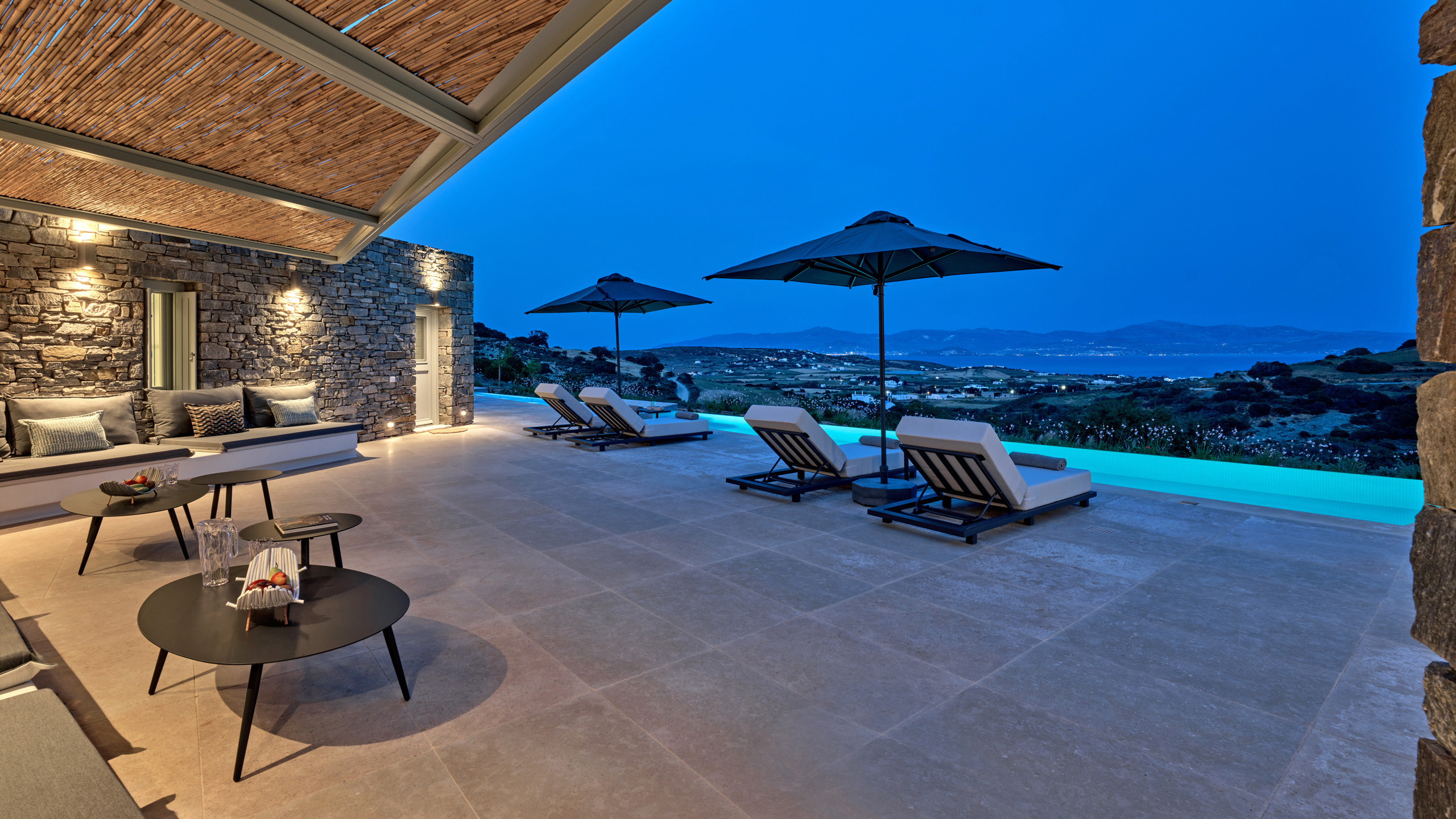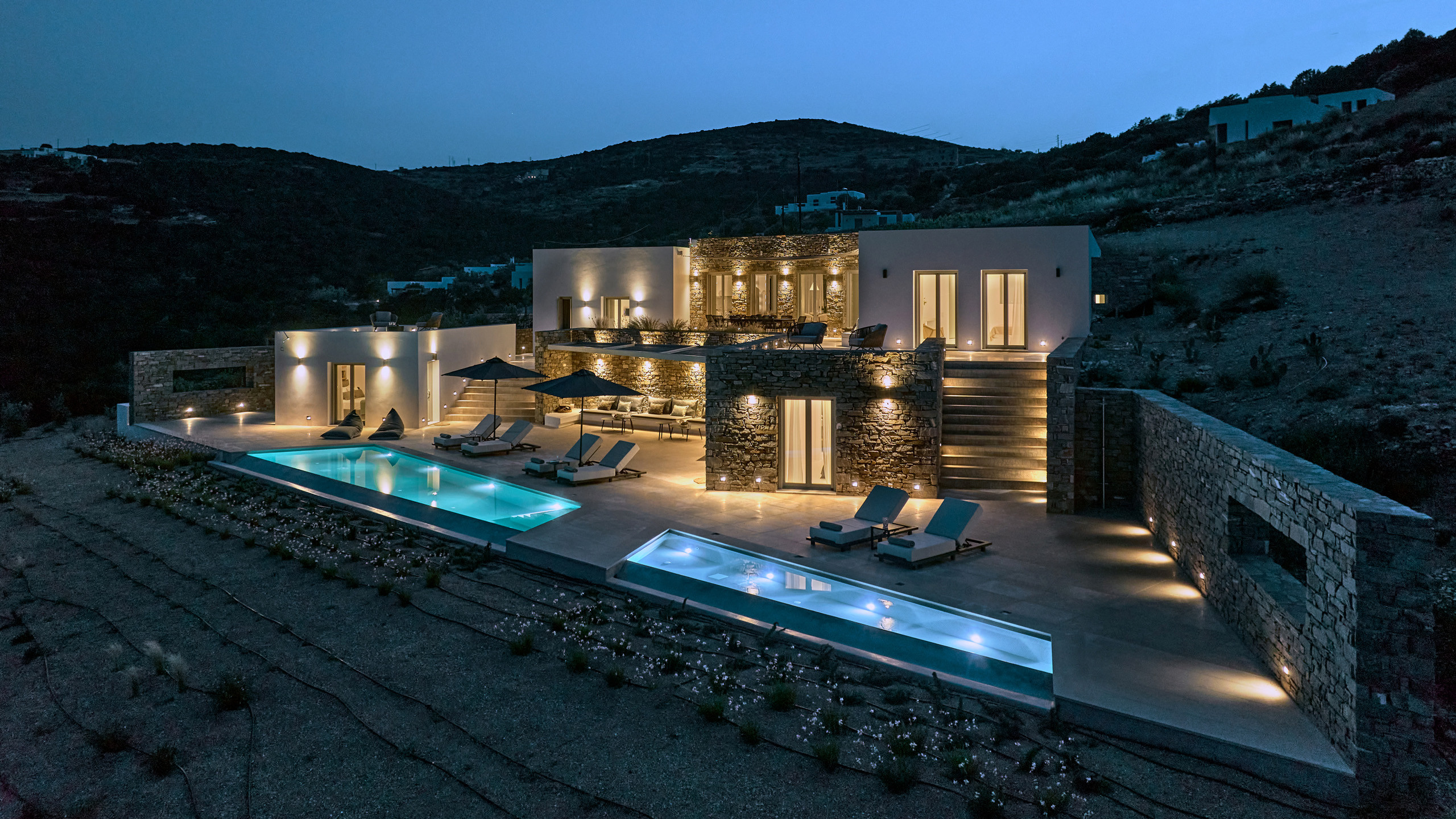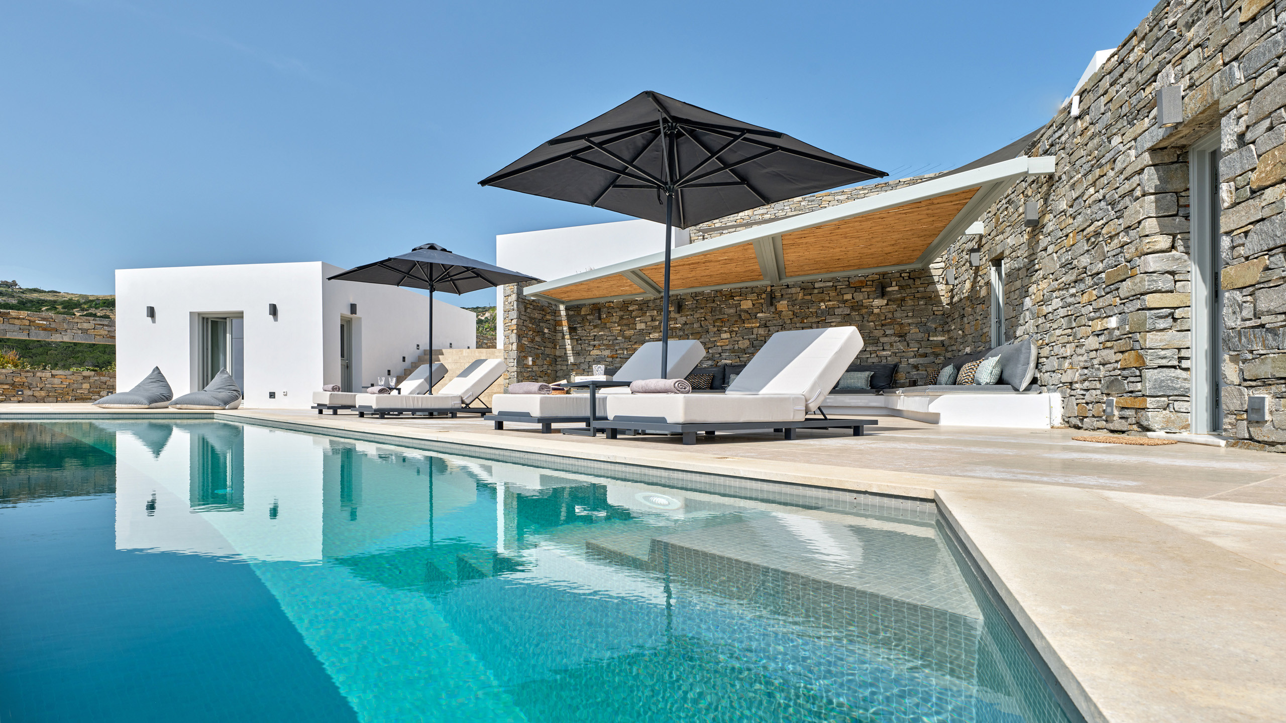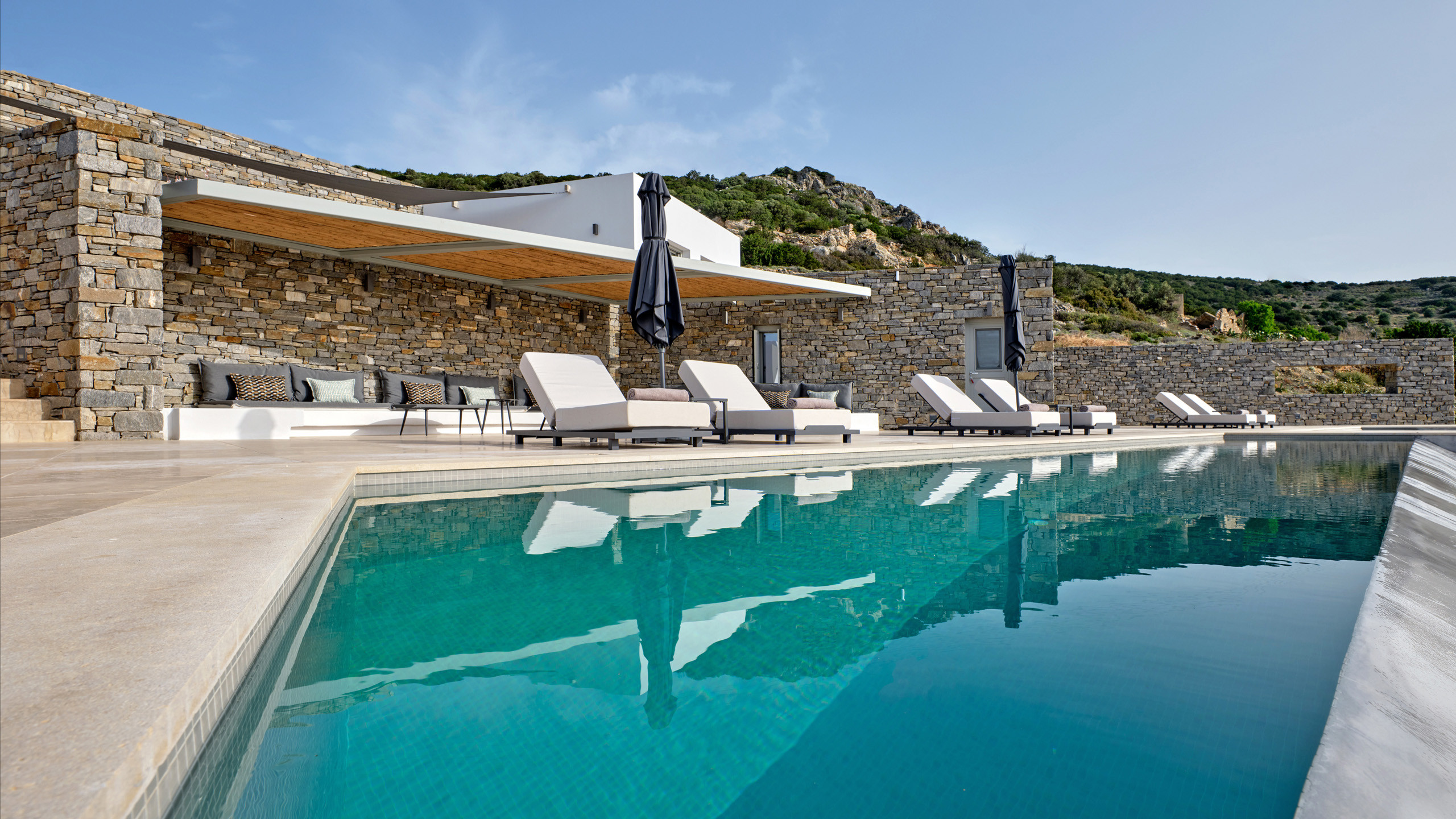 Recently completed, Villa Kulmus is modern in design and is privately located close to the popular, cosmopolitan town of Naoussa. The impressive house design flows effortlessly between indoor and outdoor living areas, enjoying Aegean Sea views across to the island of Naxos.