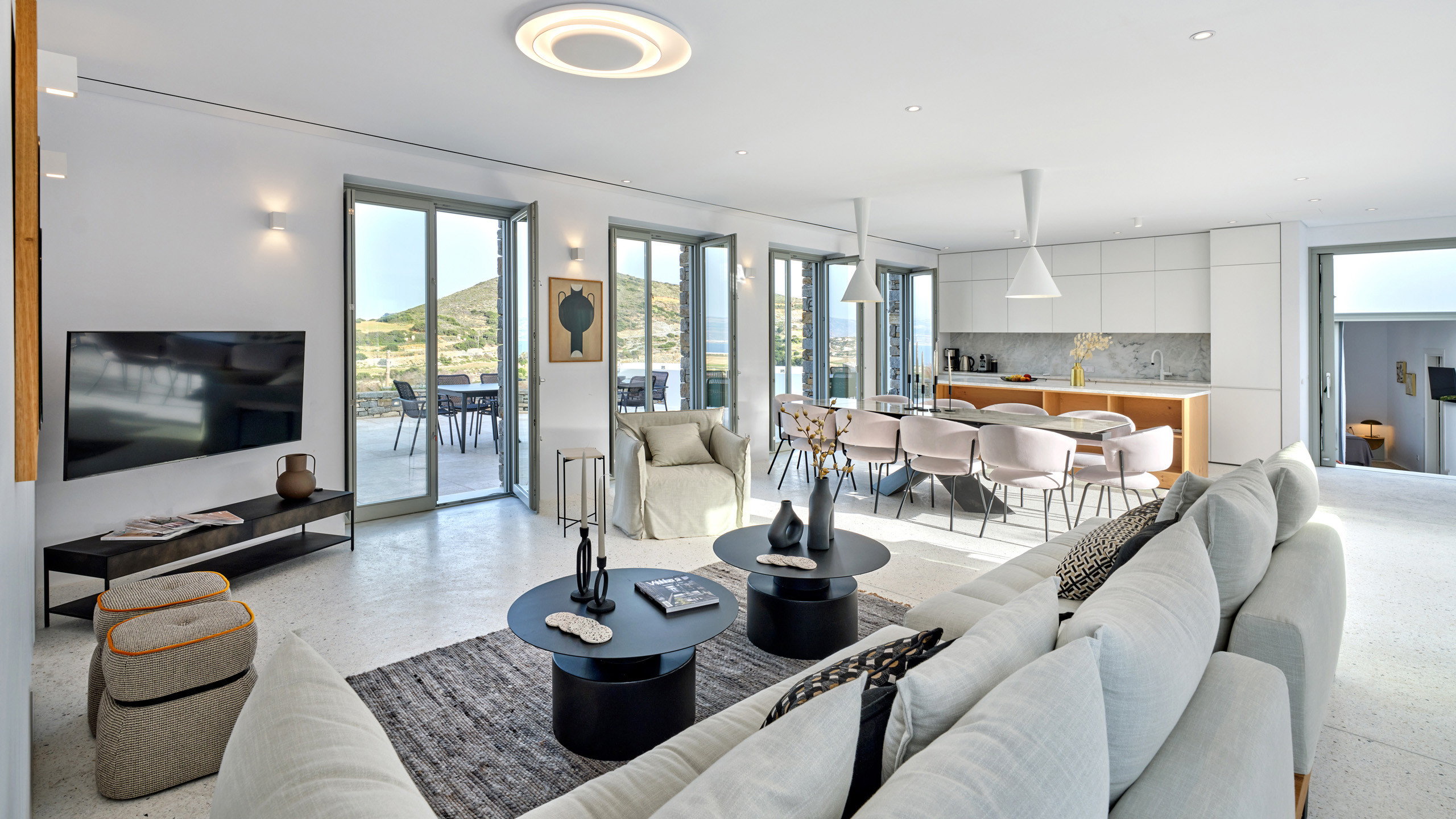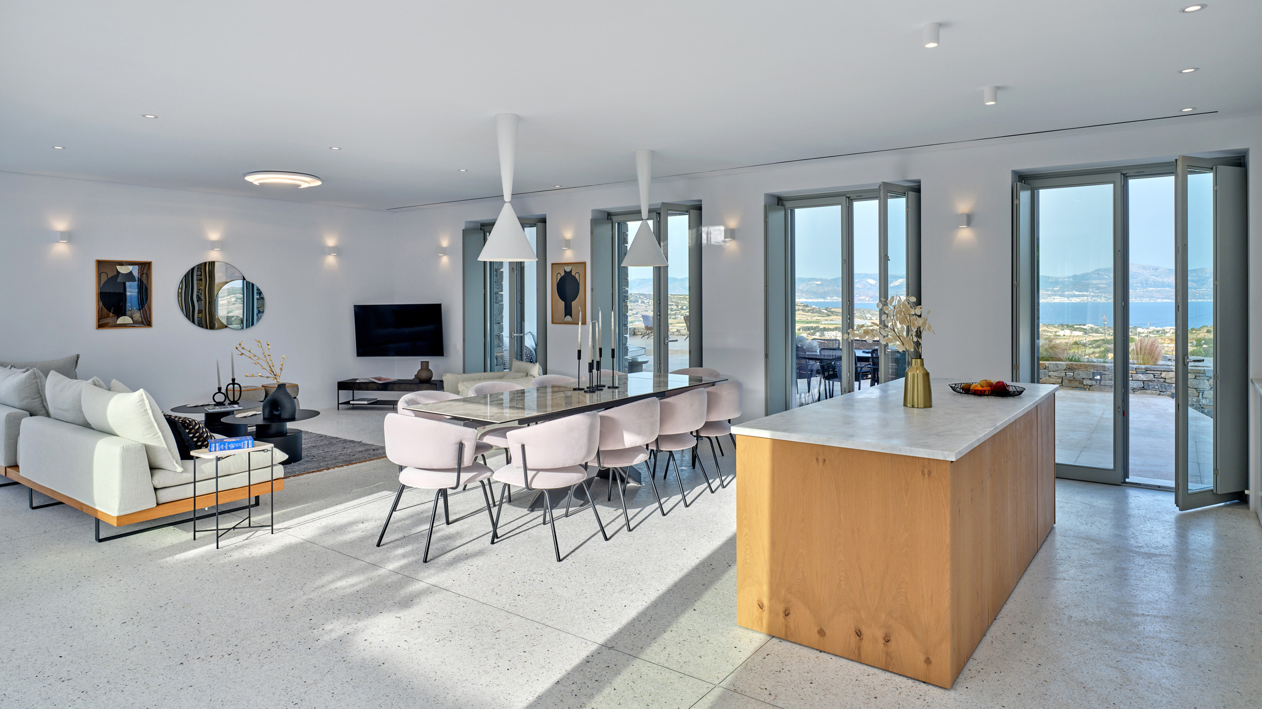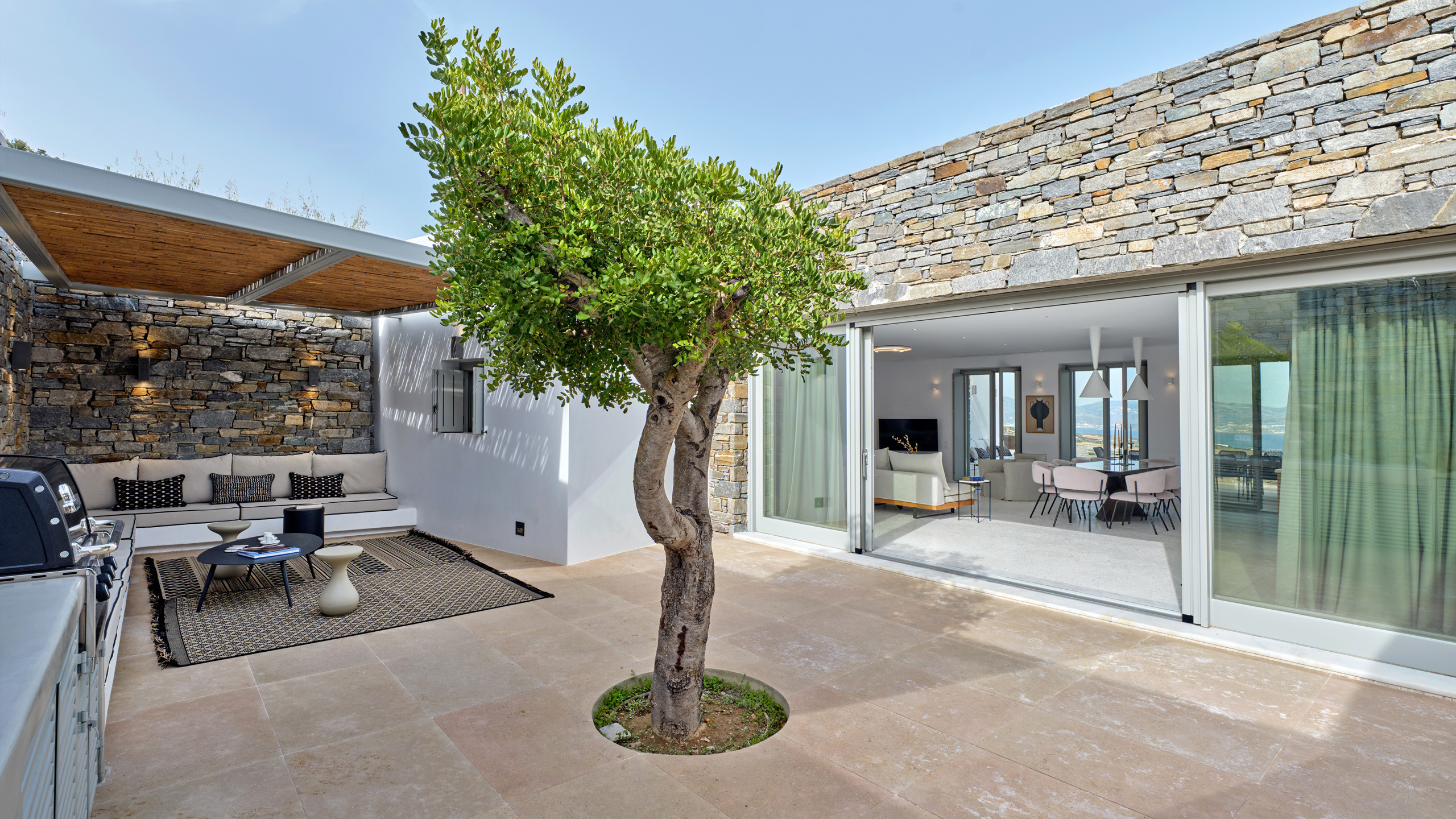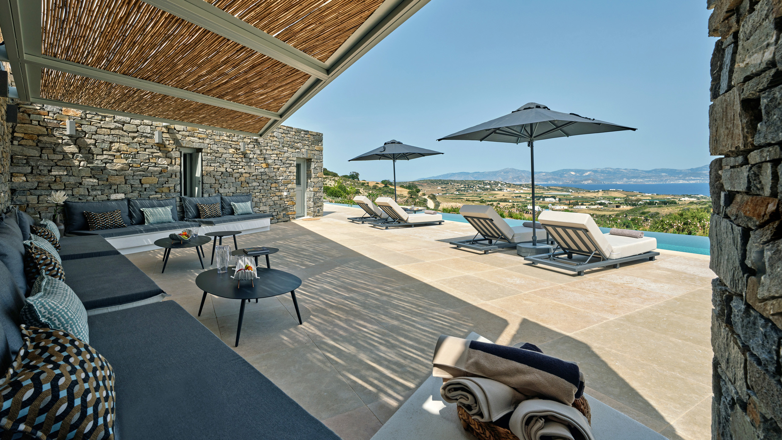 Recently completed, Villa Kulmus is modern in design and is privately located close to the popular, cosmopolitan town of Naoussa. The impressive house design flows effortlessly between indoor and outdoor living areas, enjoying Aegean Sea views across to the island of Naxos.