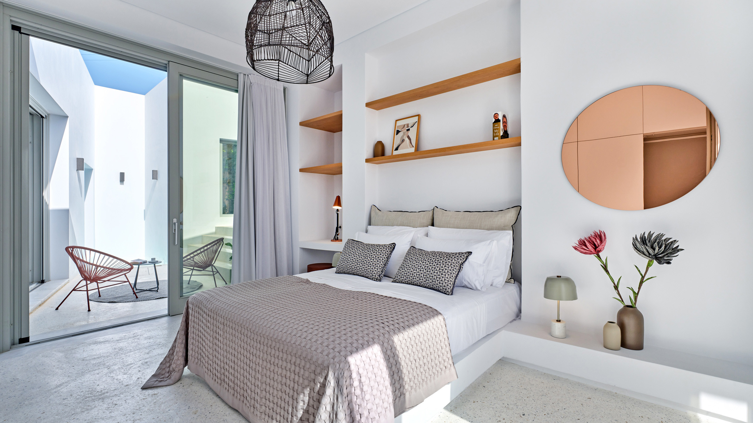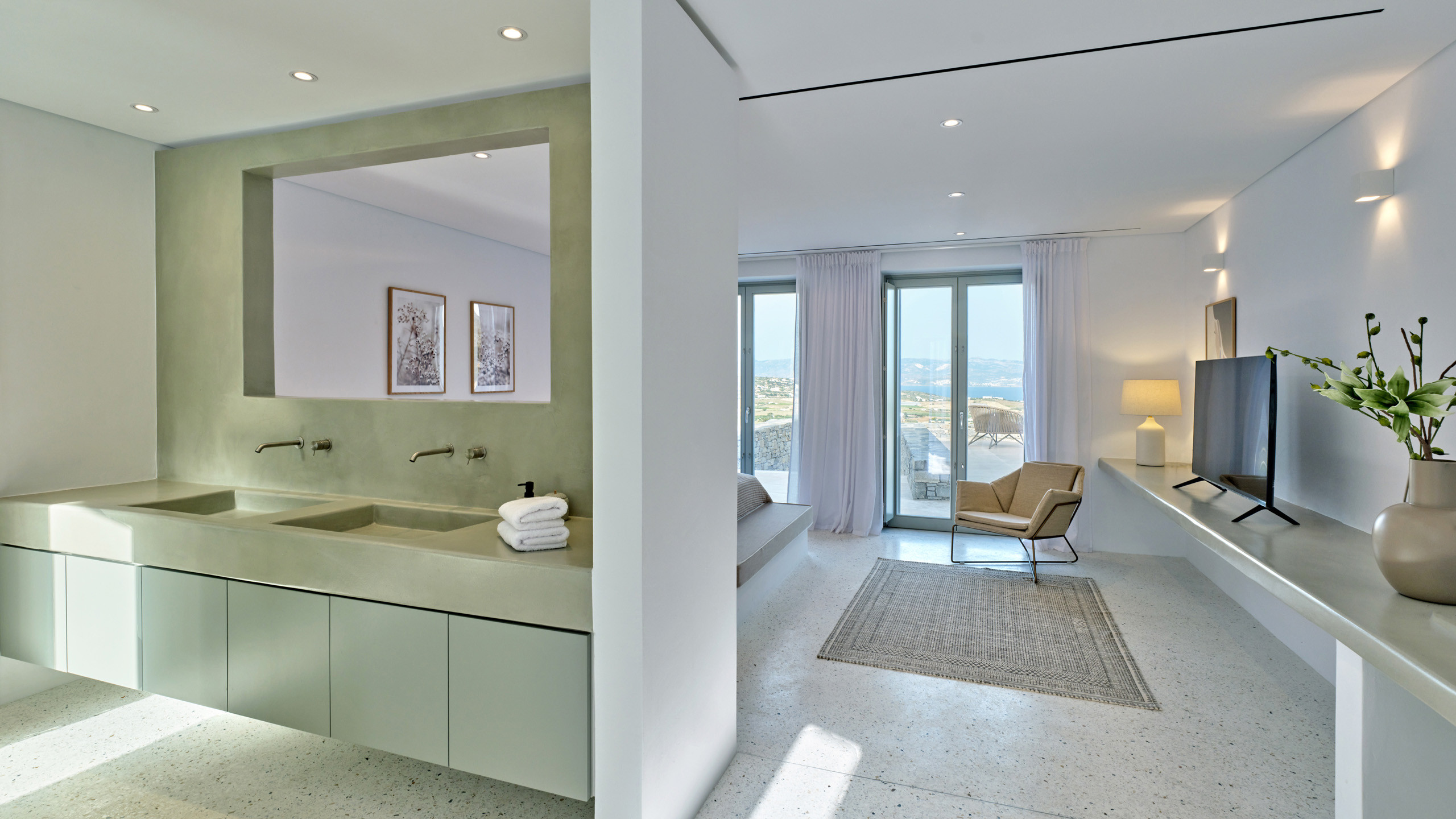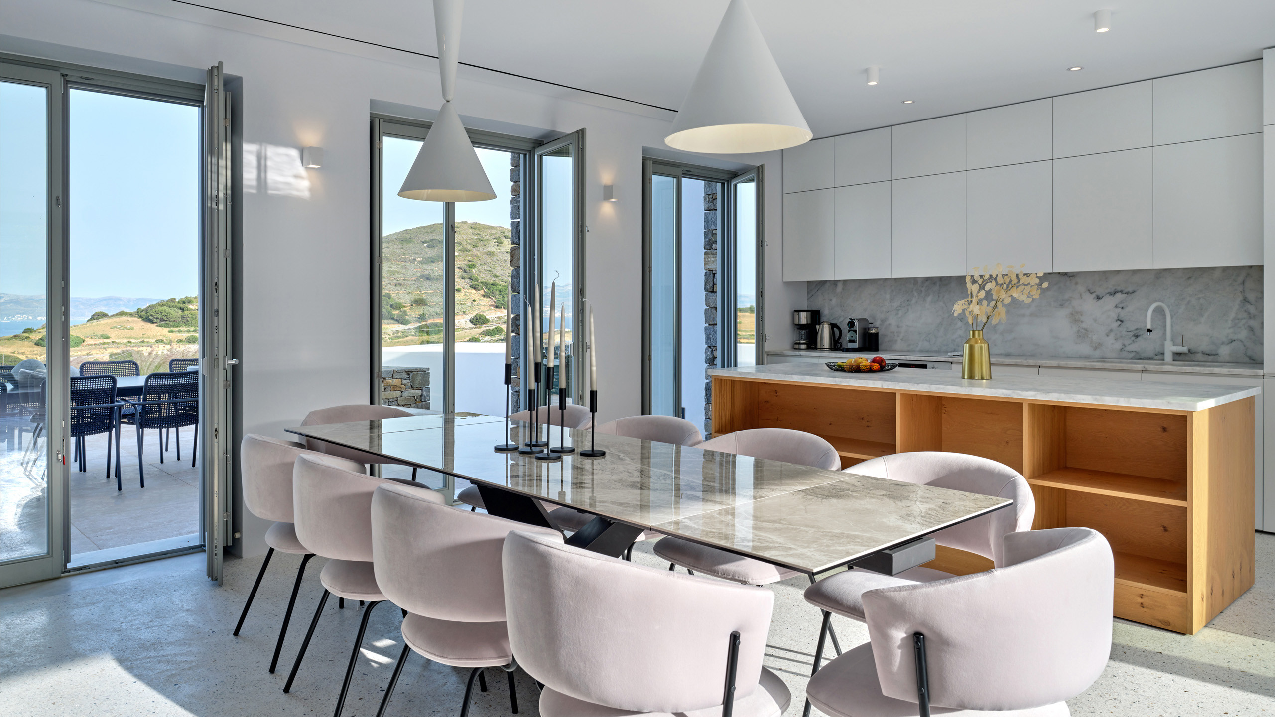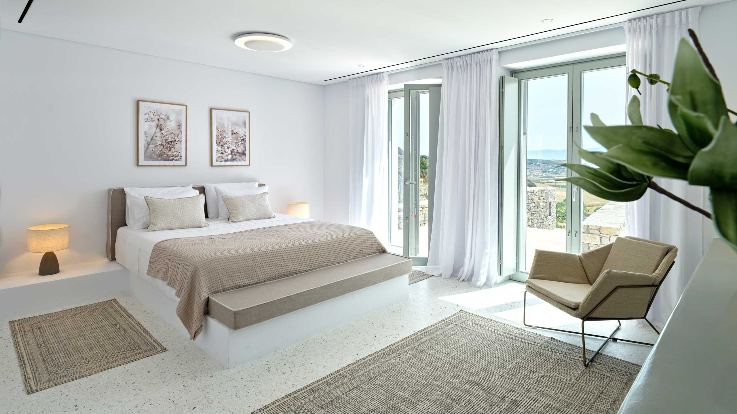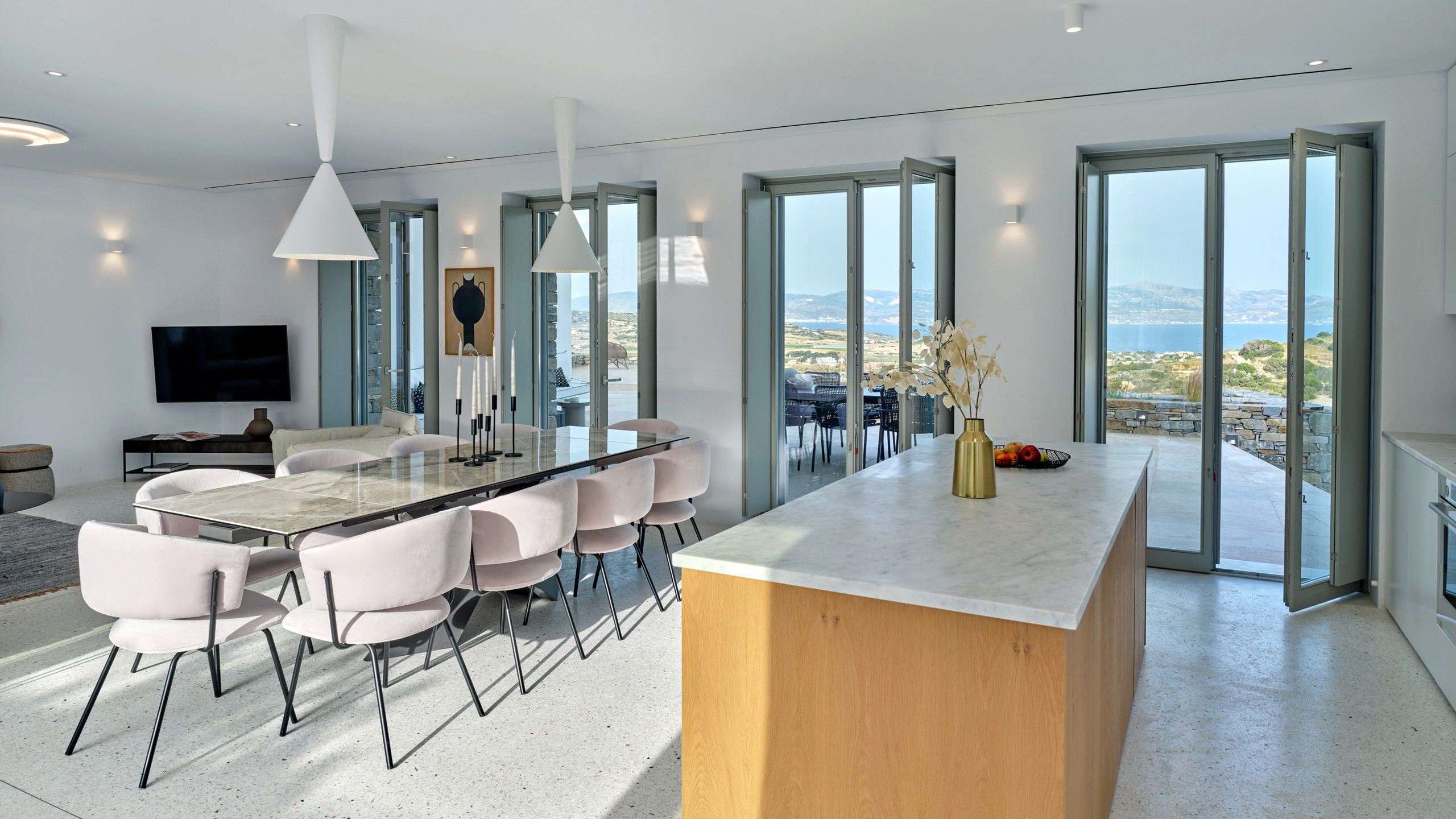 Recently completed, Villa Kulmus is modern in design and is privately located close to the popular, cosmopolitan town of Naoussa. The impressive house design flows effortlessly between indoor and outdoor living areas, enjoying Aegean Sea views across to the island of Naxos.