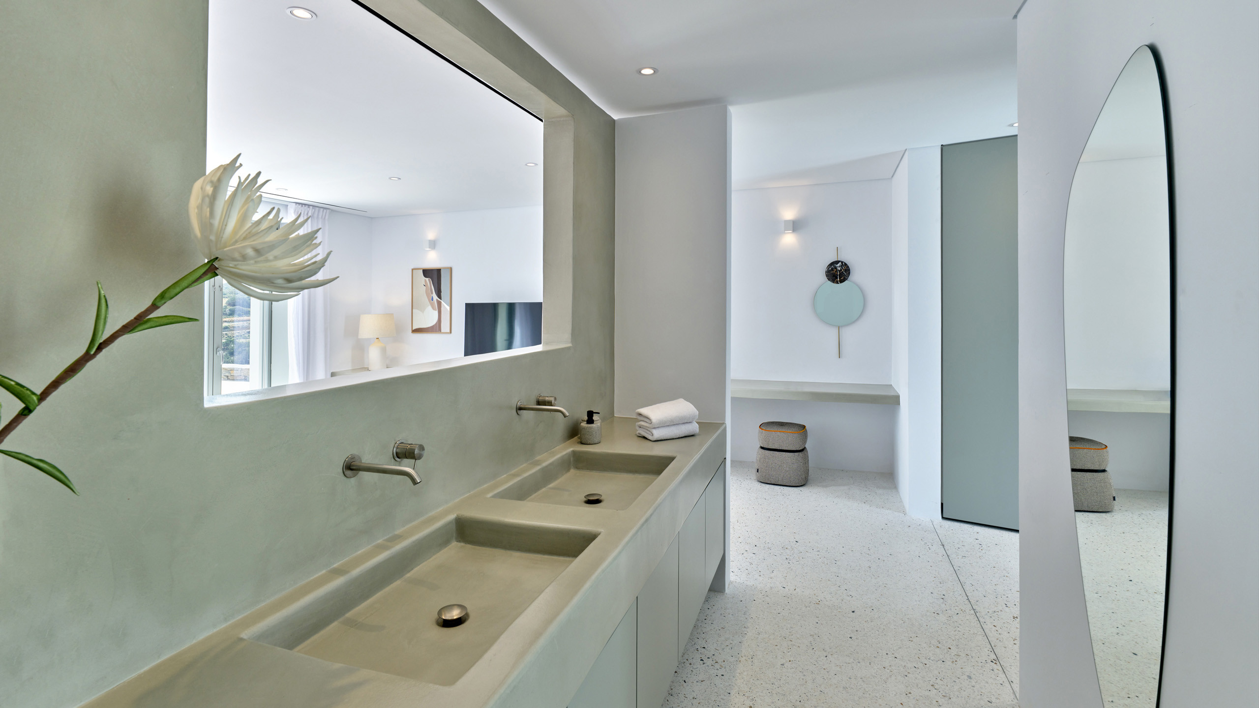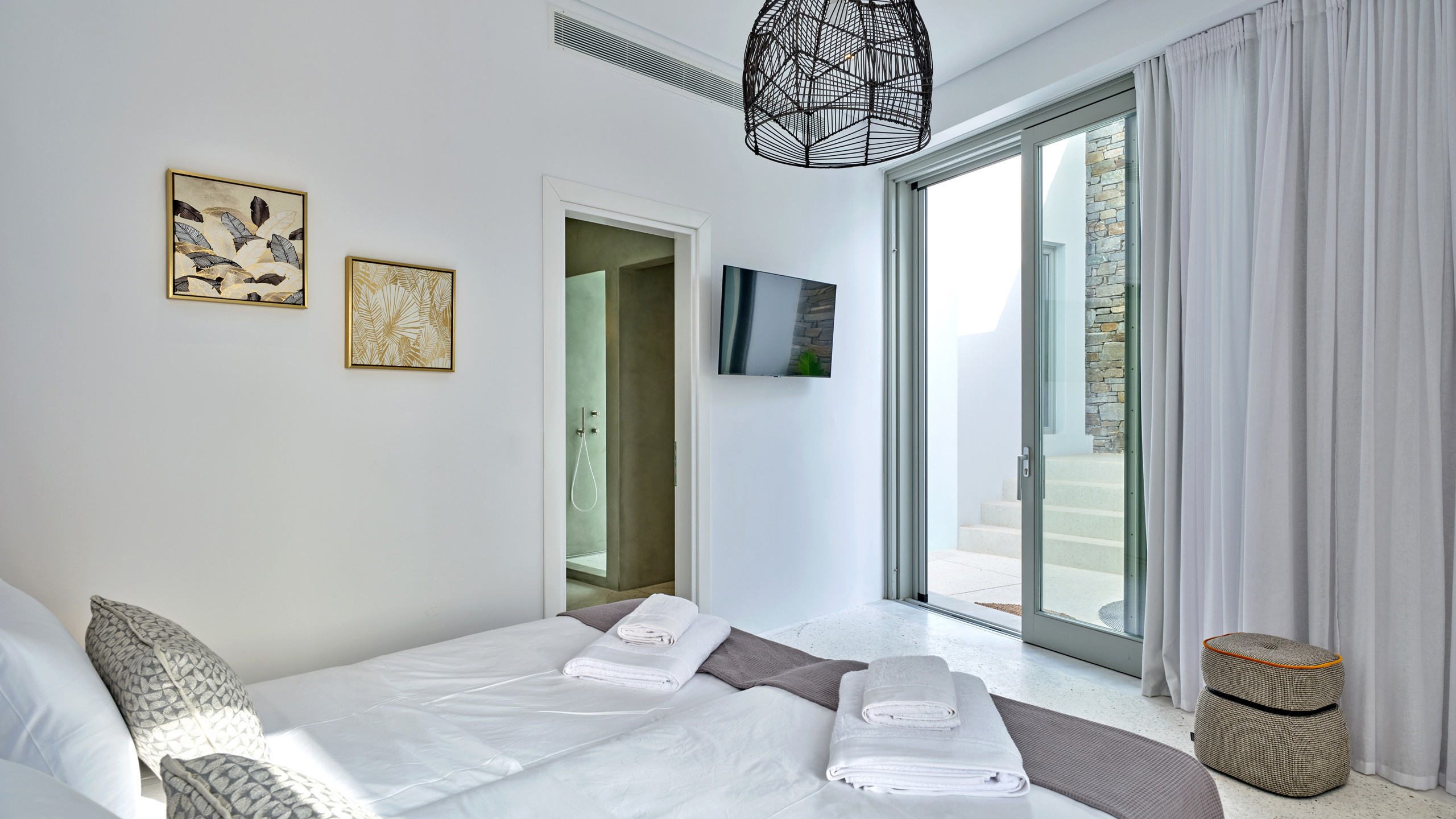 Located on the first level is the master bedroom and two guest suites. The master bedroom with ensuite is located on the Northern side of the house and enjoys direct access to the outdoor terrace. There are two guest bedrooms, each with ensuite, located on the Southern side of the house. One of the guest bedrooms has twin beds and both rooms have direct access to the outdoor terrace.
