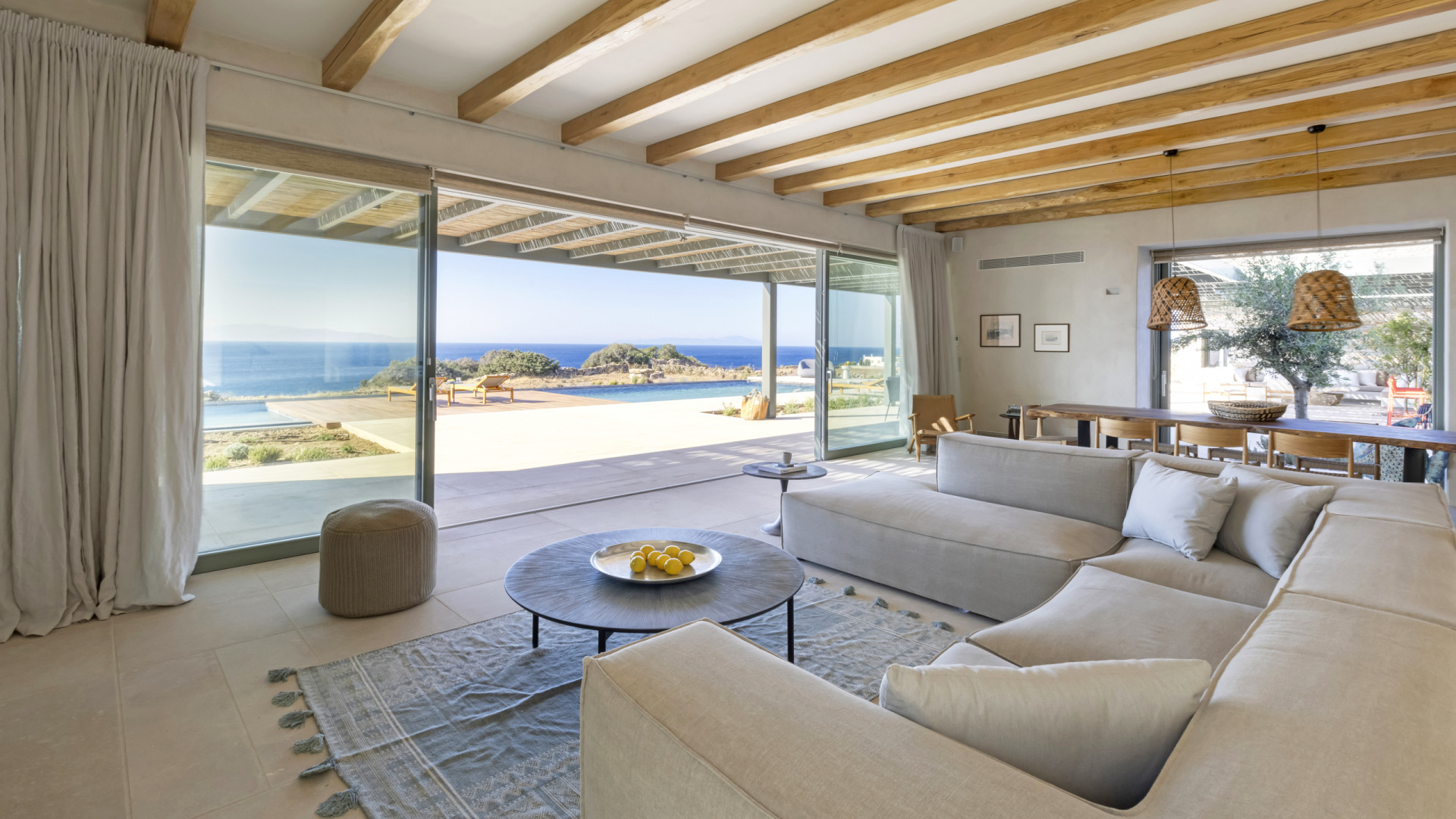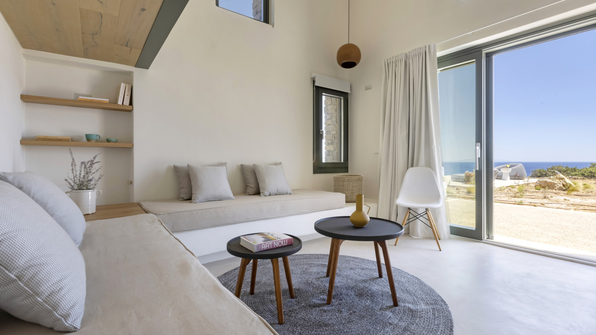 The interiors of Meadows are elegant and refined, dominated by warm wood tones, creating a cozy and luxurious ambiance without excess. The furnishings are carefully selected to align with the overall atmosphere, ensuring the highest quality and harmony. The main building houses airy and bright communal areas that open to the sea through large sliding glass doors, as well as three comfortable bedrooms. All bedrooms boast sea views and open onto a delightful inner courtyard with lemon and hibiscus trees, pomegranates, and primroses. The stone building at the western end of the property contains two separate guest houses, each equipped with a living room that can convert into a bedroom for two children, a small kitchen, and a loft-style bedroom on the mezzanine level. Here too, sea views are guaranteed, offering guests in this part of the house a touch of extra privacy.