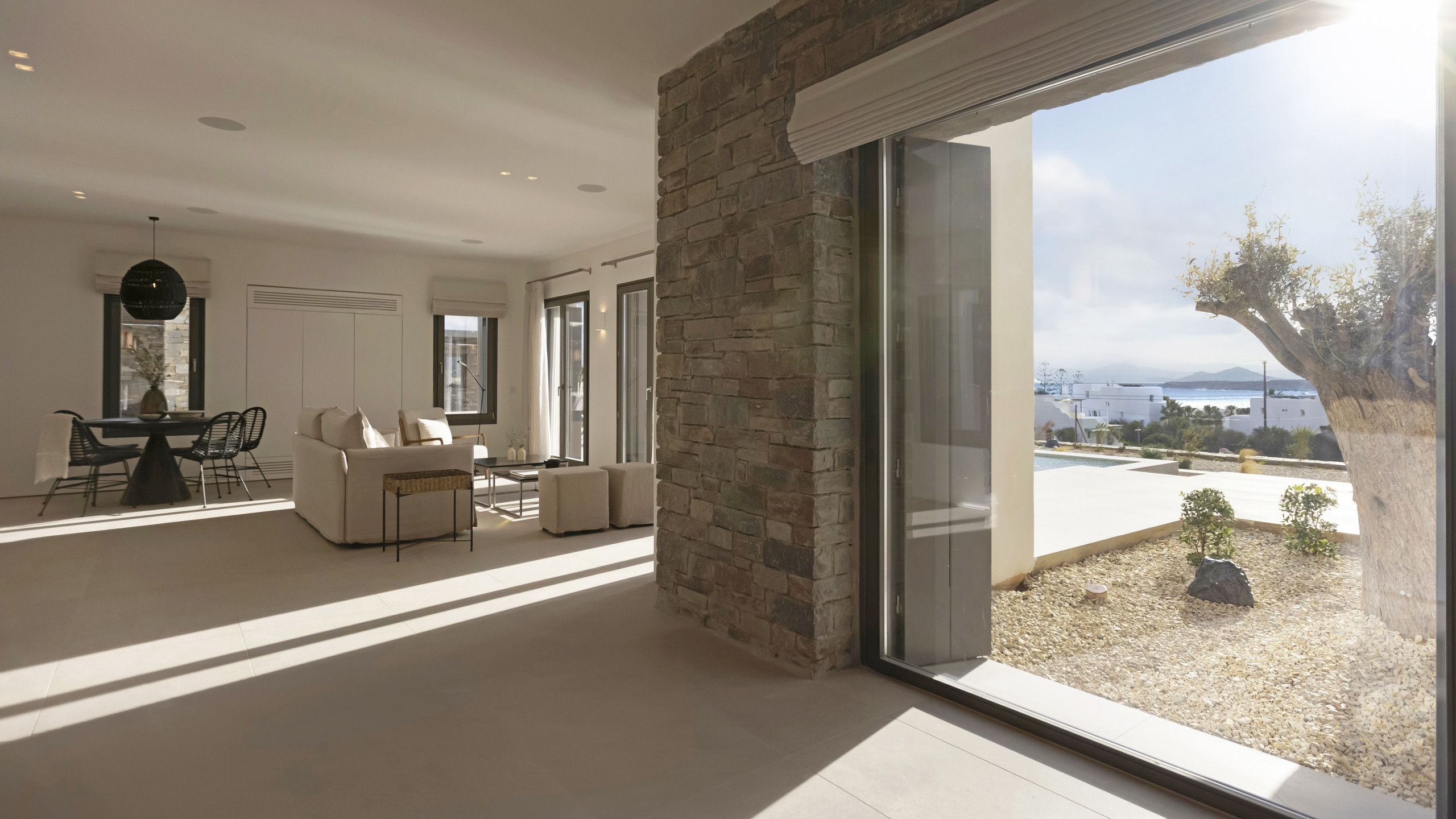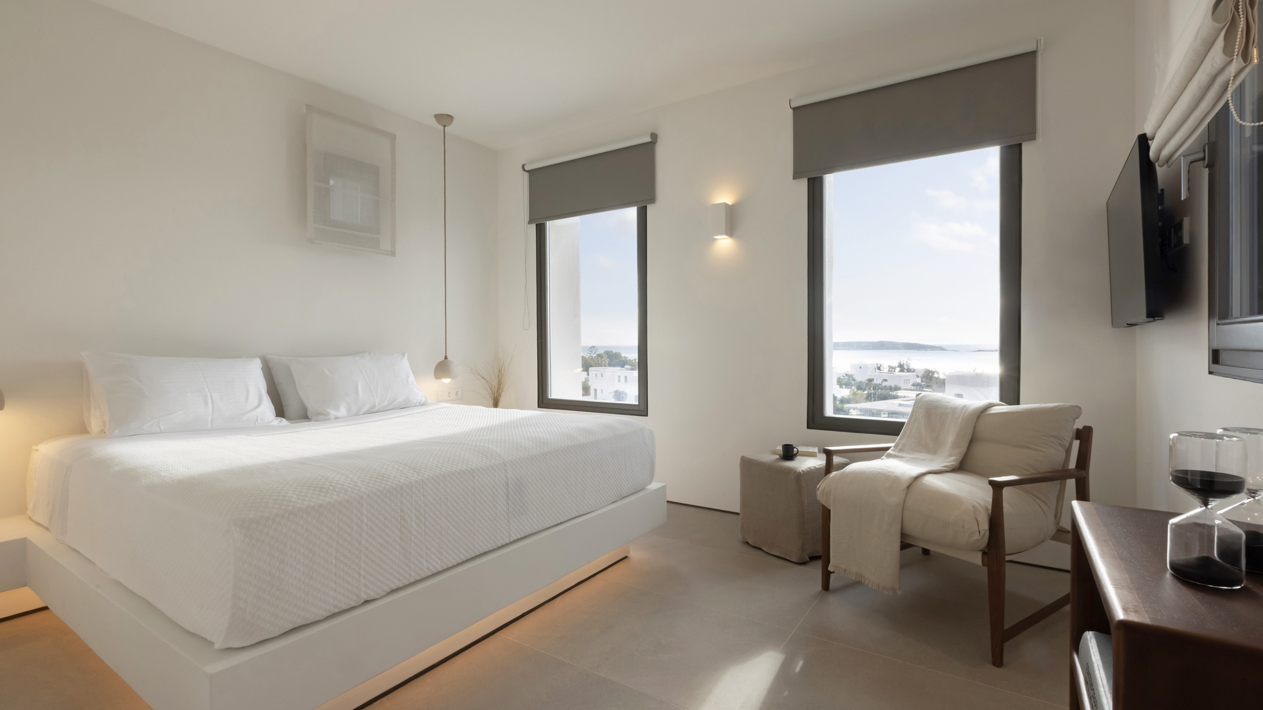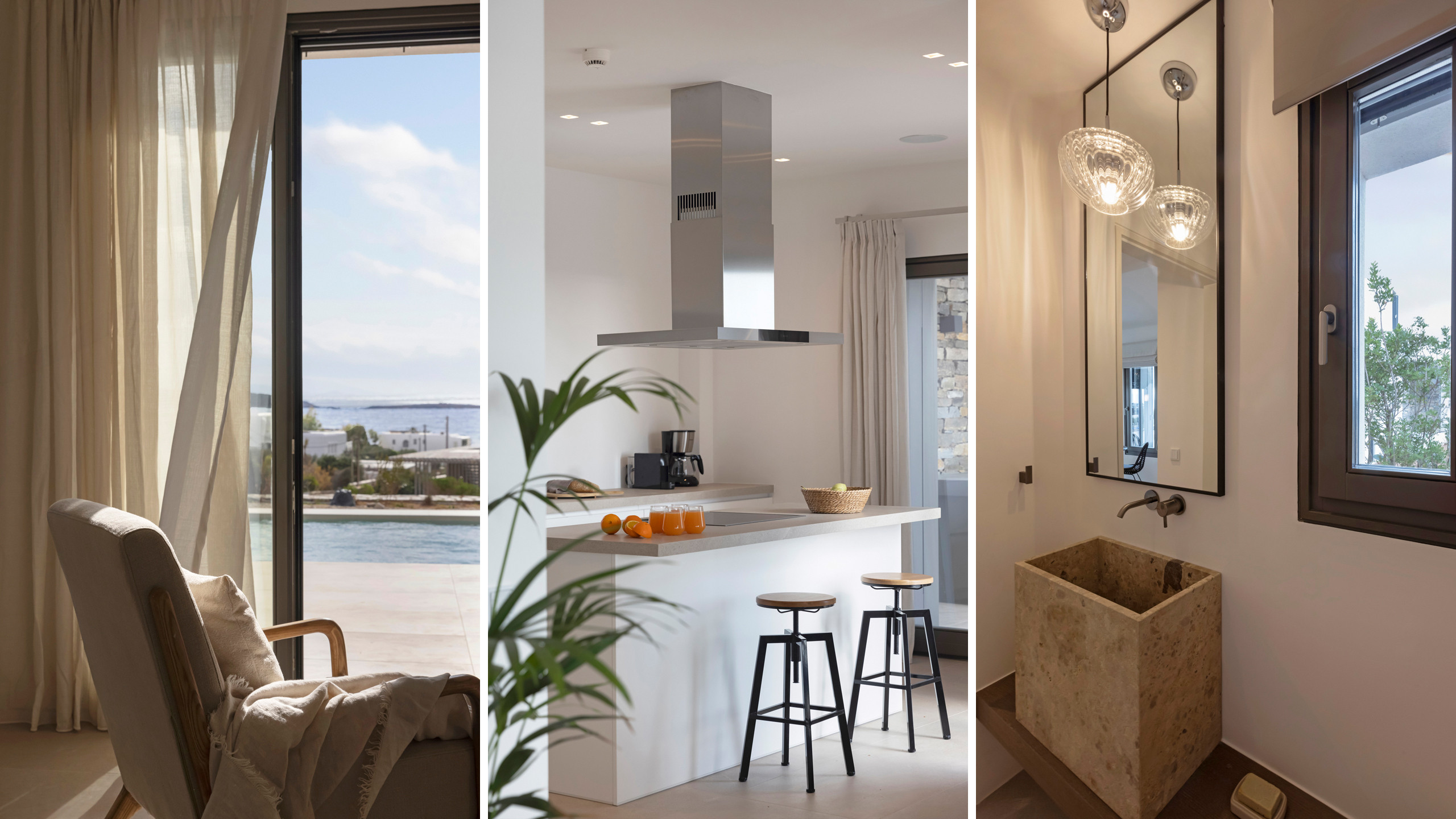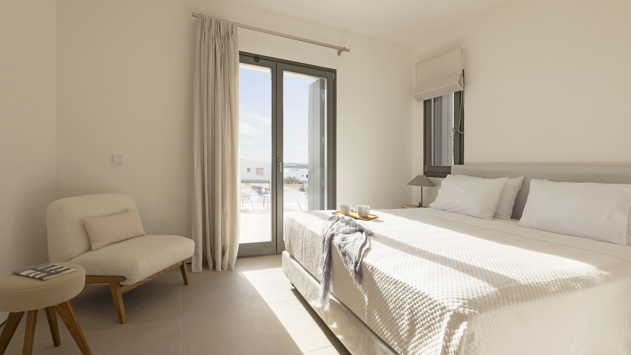 Inside, Myrtle East exudes a modern and minimalist charm. The atmosphere is serene, and the layout is both practical and inviting, with communal spaces that flow effortlessly into the outdoors, creating a seamless connection with nature and flooding the interiors with natural light. The bedrooms are spread across three levels, following the traditional island architecture. Each room is designed with comfort and contemporary elegance in mind, offering all the amenities expected from a high-end property.