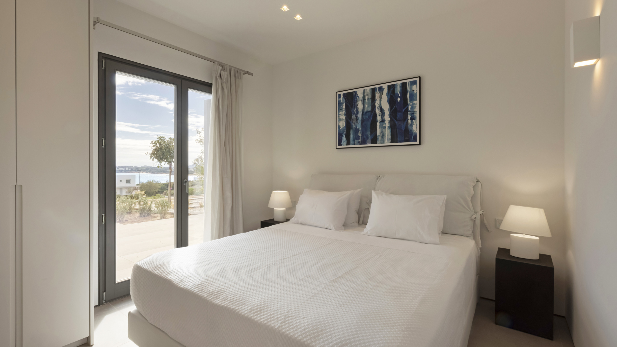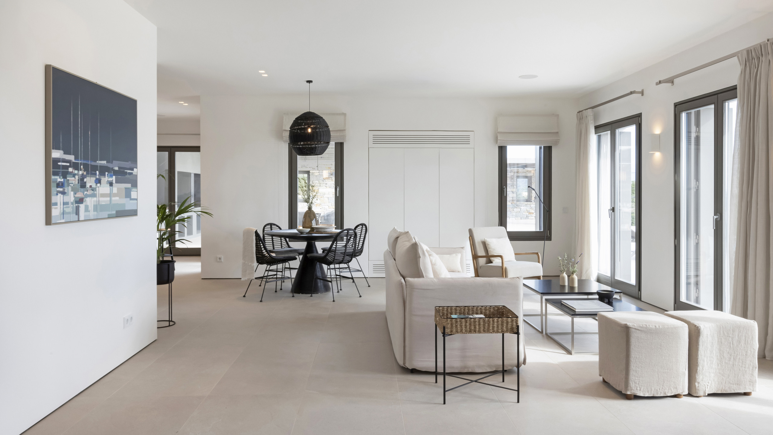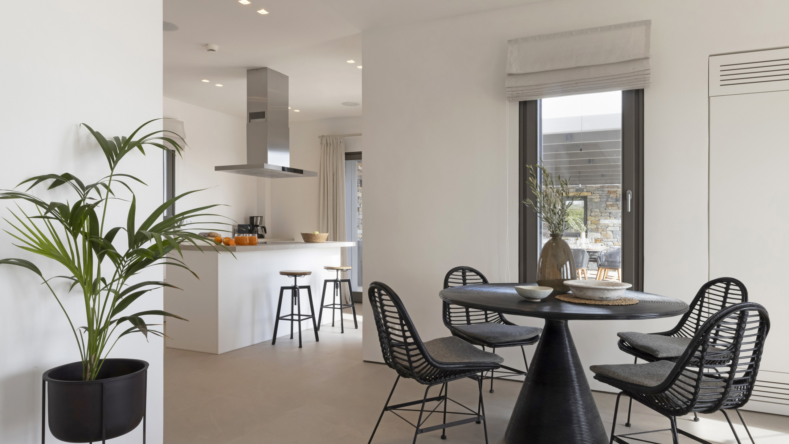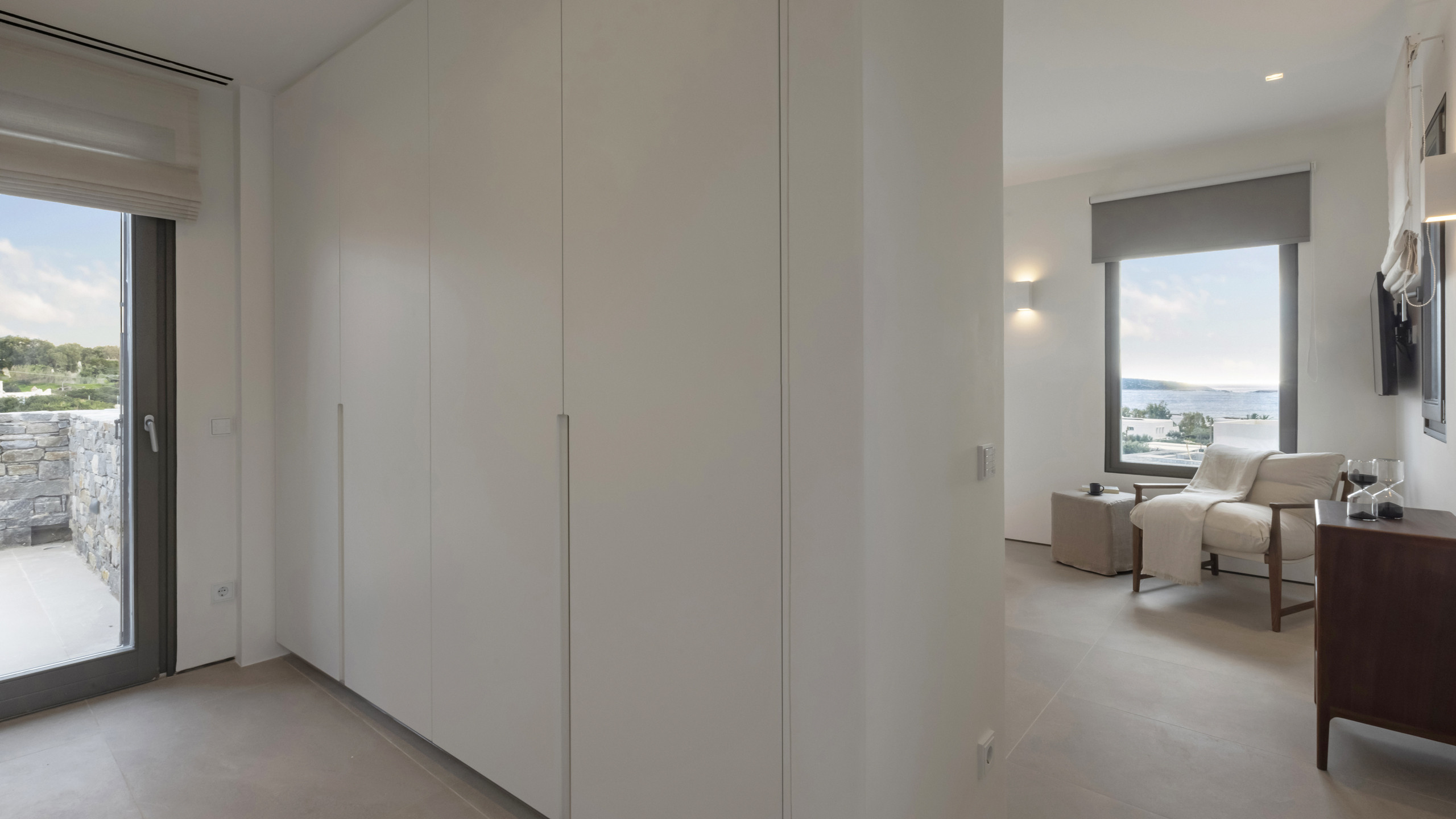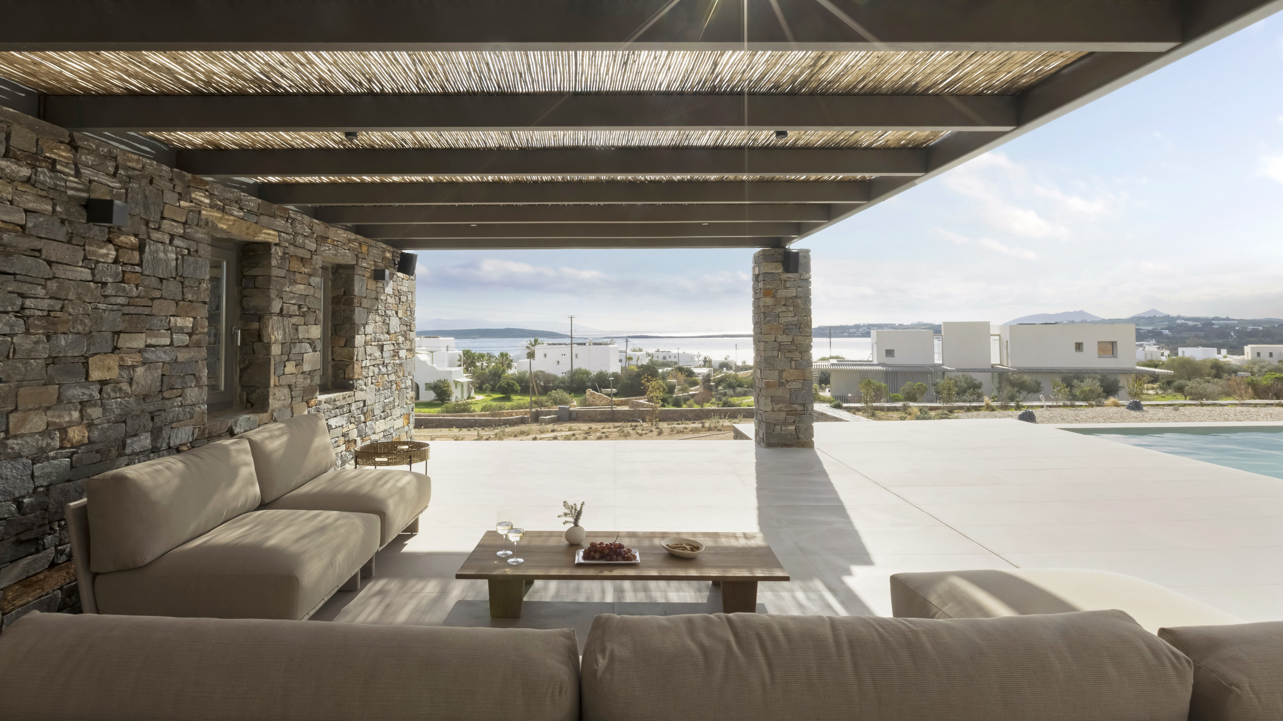 Inside, Myrtle East exudes a modern and minimalist charm. The atmosphere is serene, and the layout is both practical and inviting, with communal spaces that flow effortlessly into the outdoors, creating a seamless connection with nature and flooding the interiors with natural light. The bedrooms are spread across three levels, following the traditional island architecture. Each room is designed with comfort and contemporary elegance in mind, offering all the amenities expected from a high-end property.