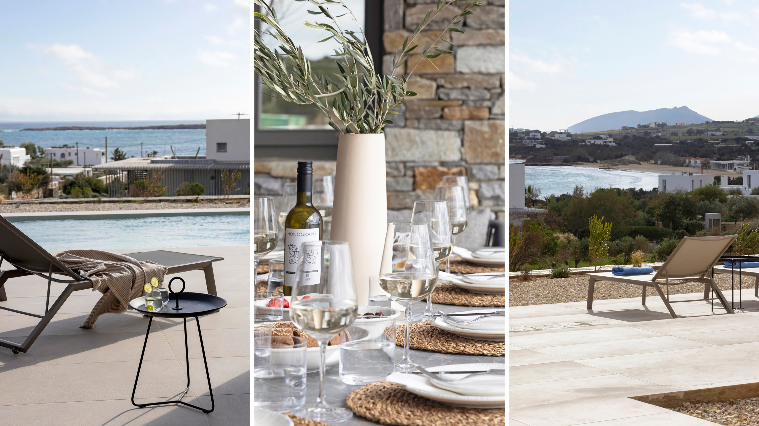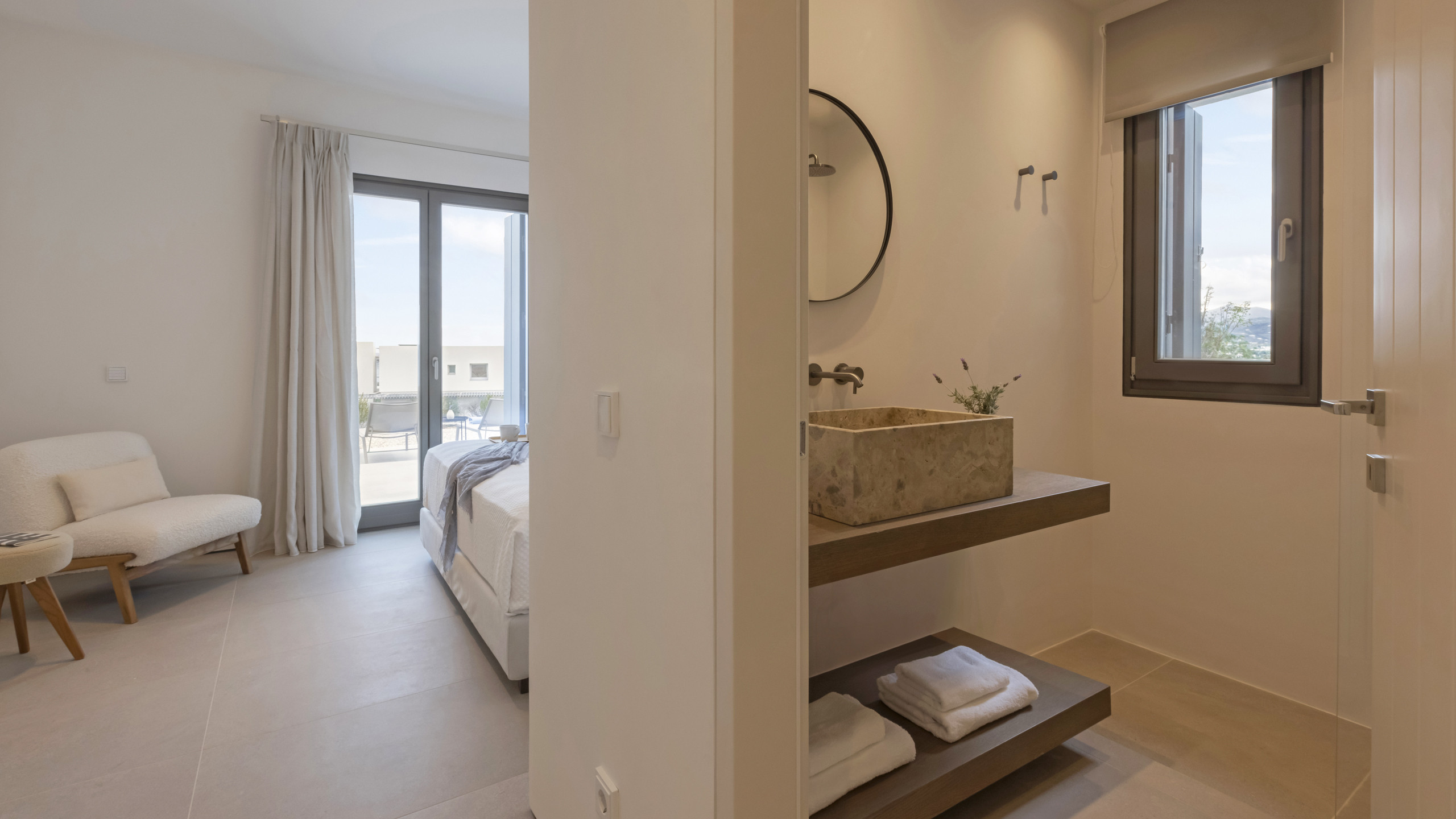 The stunning Myrtle East, part of a twin-property mini complex, is elegantly situated above Santa Maria Beach, one of Paros’ most coveted and cherished locations. From this elevated vantage point, guests are treated to breathtaking views of the Aegean Sea, with the beach just a short walk away and the bustling town of Naoussa easily accessible by car.