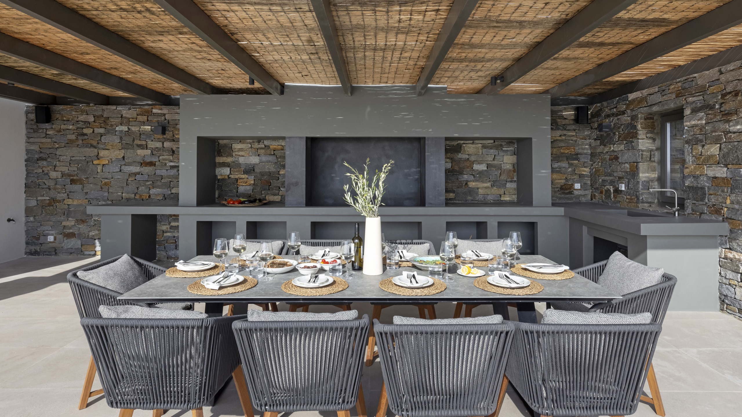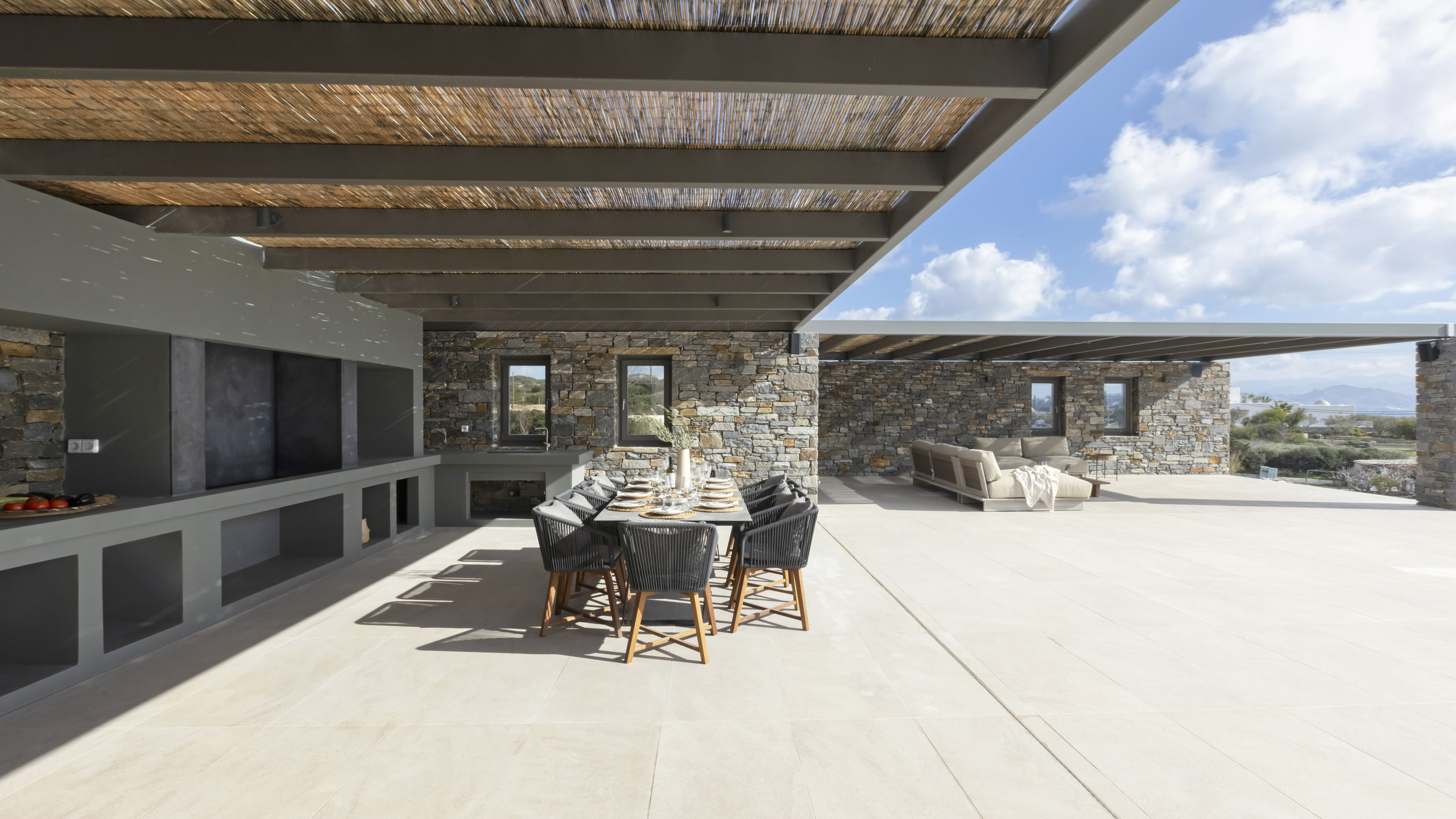 The outdoor areas are expansive and meticulously designed in classic Cycladic fashion, featuring a large infinity pool that seamlessly blends with the horizon on the main terrace. At one end, a spacious pergola shades a welcoming dining area, perfect for enjoying meals al fresco while soaking in the mesmerizing sea views that stretch endlessly before you.
